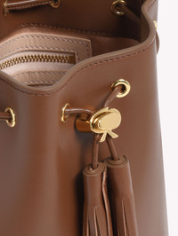 Crafted from leather and embellished with Chakra-inspired natural cabochon stones, Sienna Shanti is a bucket bag with the signature Ribbon toggle, a top handle and an adjustable and removable shoulder strap. The inside of the bag, lined in satin, presents a pocket and a metallic zip. Handmade in Italy. Size: H 20cm; W 16cm; D 13cm. - Heel Height: RB - Model Code: B00390.RBKPI Item ID: B00390.RBKPI.VBECUOI_PZ