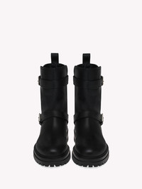 Set on a tonal rubber lug sole, Thiago is a leather pull-on biker boot with metallic buckles and a wide boot shaft. Handmade in Italy. - Heel Height: 0.8 inches / 20 mm - Model Code: U73000.20GOM Item ID: U73000.20GOM.CLNNERO