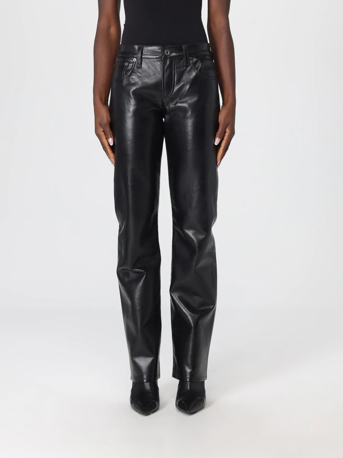 DESCRIPTION - Style: Rock, Urban-street - Pockets: 5-pocket - Waist: 미디엄 웨이스트 - Bottom: With straight hemline - Closure: With button and zip - Materials: Smooth synthetic leather - Pattern: Plain-colored DETAILS AND CARE Composition _ SIZE AND FIT Sizes not available Size and fit Straight Designer code: A2811285 DETOX Giglio Code: H55625 Designer: Agolde Collection: Agolde Woman Category: Clothing Agolde