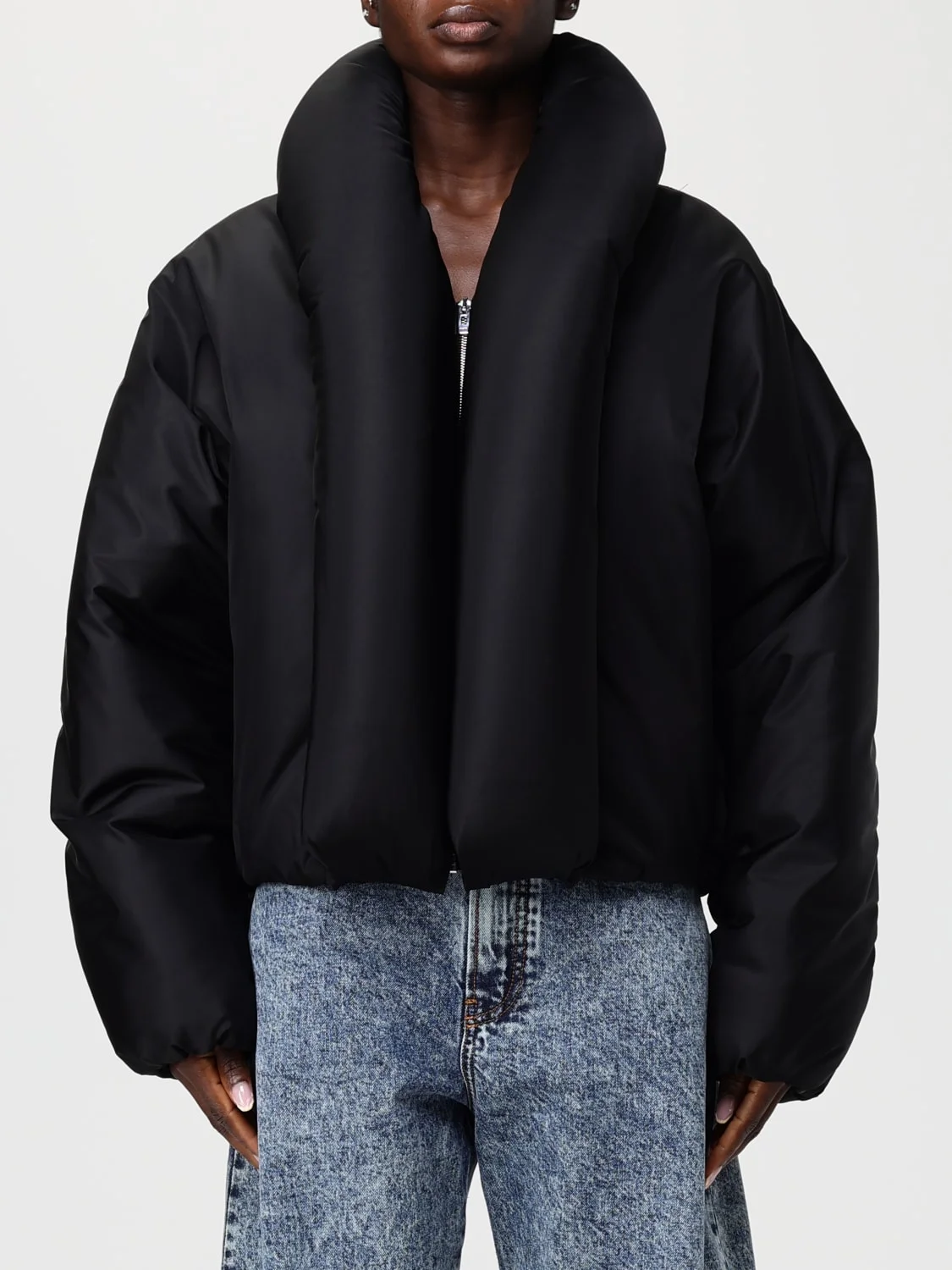 DESCRIPTION - Style: Contemporary, Urban-street - Neck: High - Shoulders: Relaxed - Sleeves: Long - Closure: Absent - Bottom: With straight hemline - Model: Padded - Length: Short jackets - Materials: Taffeta - Pattern: Plain-colored DETAILS AND CARE Composition not available SIZE AND FIT Sizes not available Size and fit Relaxed fit Designer code: AA9V1163T448B 995 Giglio Code: H54547 Designer: Alaia Collection: Alaia Woman Category: Clothing Alaia