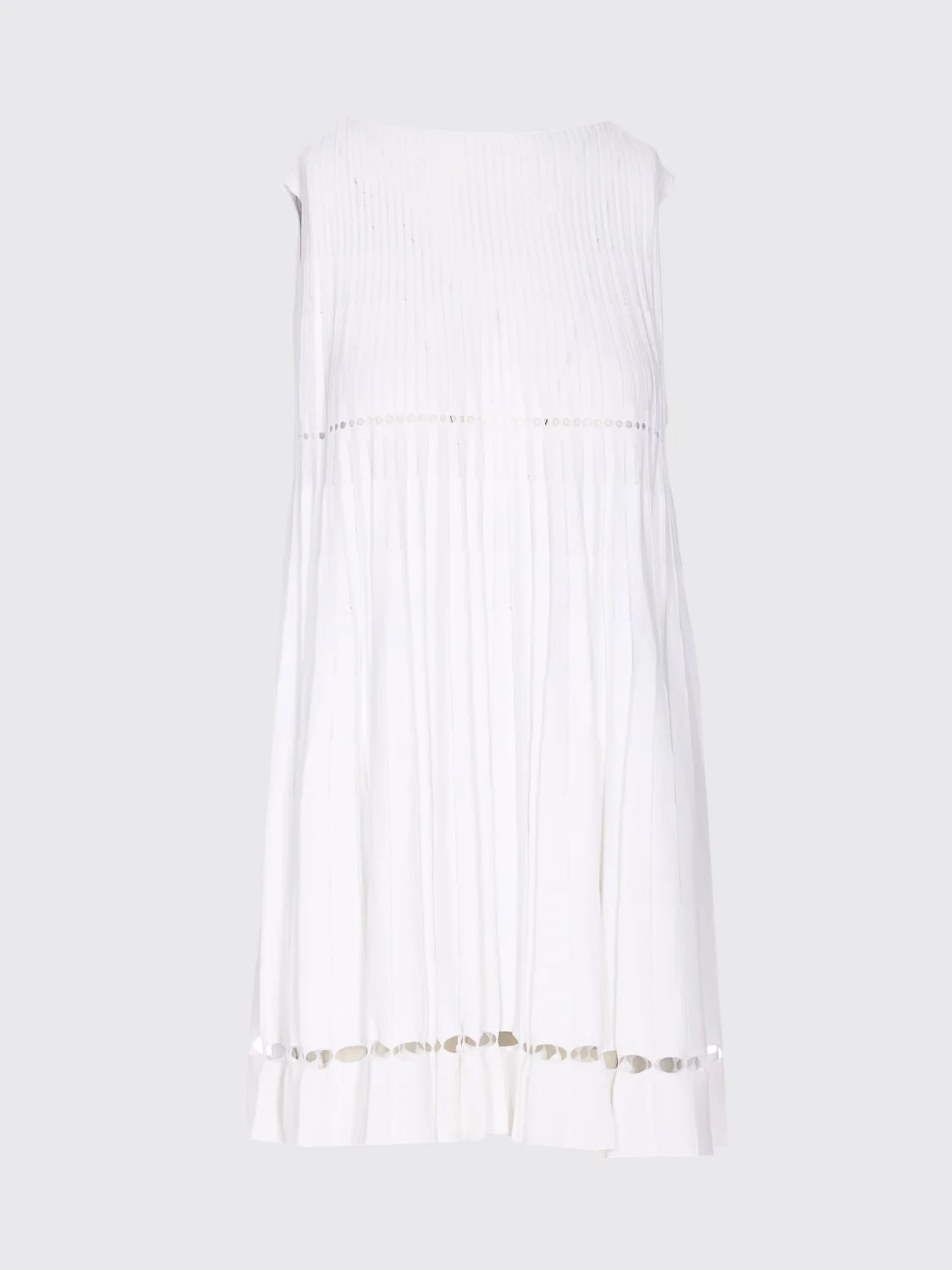 DESCRIPTION - Style: Classic - Model: Pierced, Pleated - Neckline: Crewneck - Shoulders: Regular - Bottom: With straight hemline - Length: Mini dresses - Occasion: Morning dresses - Sleeves: Sleeveless dresses - Materials: Viscose blend - Pattern: Plain-colored DETAILS AND CARE Composition 96% viscose, 6%polyester SIZE AND FIT Sizes not available Size and fit Regular fit Designer code: AA9R2674K078B 000 Giglio Code: H57281 Designer: Alaia Collection: Clothing Alaia Category: Clothing > Dress