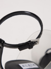 DESCRIPTION - Lining: With logo - Toe: Open - Ankle: With strap - Sole: Leather - Heel: undefined - Materials: Patent leather - Pattern: Plain-colored DETAILS AND CARE Composition not available SIZE AND FIT Sizes Heel: 9 cm Designer code: AA3S116CK299 999 Giglio Code: G68236 Designer: Alaia Collection: Alaia Woman Category: Shoes Alaia