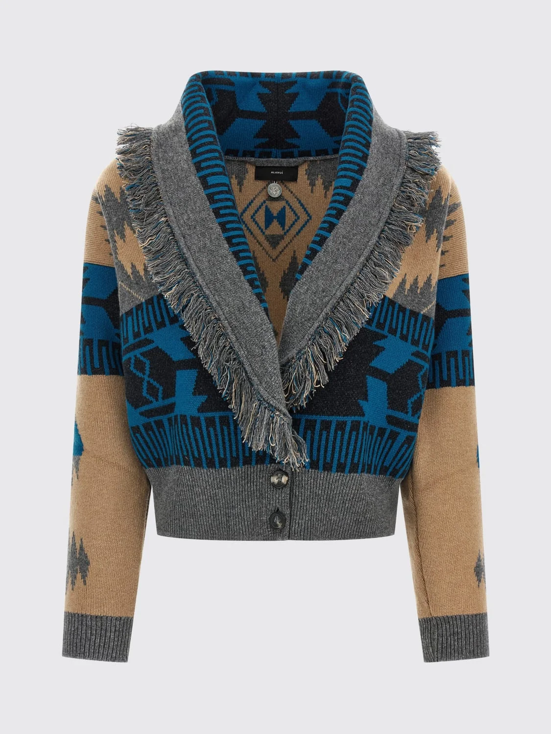 DESCRIPTION - Style: Classic, Ethnic - Details: With fringes - Neck: Shawl - Neckline: V neckline - Shoulders: Regular - Sleeves: Long - Cuffs: Ribbed - Closure: With buttons - Bottom: With ribbed edges - Materials: Virgin wool - Pattern: Jacquard DETAILS AND CARE Composition 70% virgin wool 30% cachemire SIZE AND FIT Sizes not available Size and fit Regular fit Designer code: LWHB026E25KNI002 6206 Giglio Code: H65780 Designer: Alanui Collection: Alanui Woman Category: Clothing Alanui