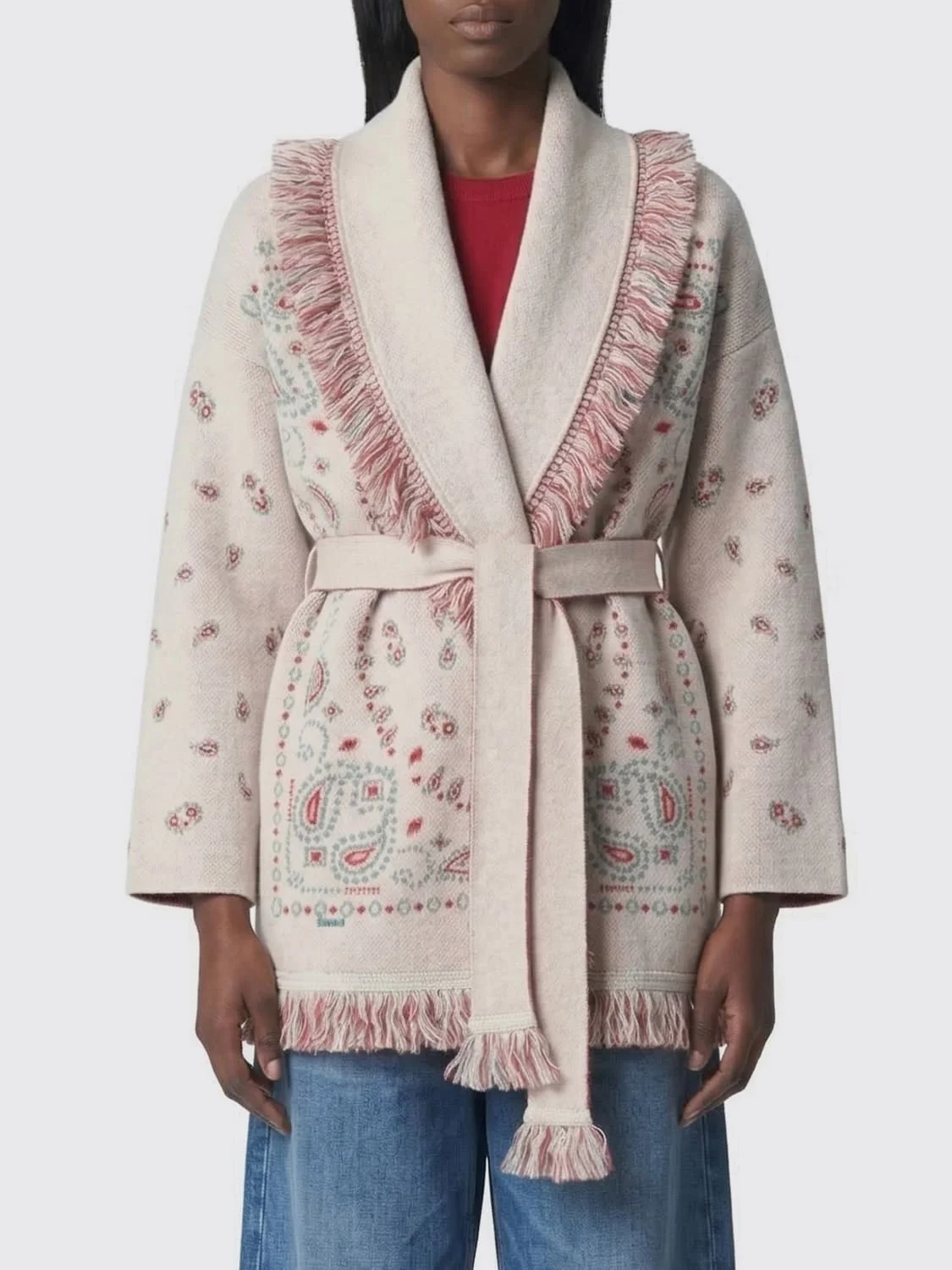 DESCRIPTION - Style: Ethnic, Vintage - Model: Robe - Neck: Shawl - Neckline: V neckline - Shoulders: Regular - Sleeves: Long - Closure: Absent - Bottom: Fringed - Materials: Cashmere - Pattern: Bandana DETAILS AND CARE Composition not available SIZE AND FIT Sizes not available Size and fit Regular fit Designer code: LWHB064R26KNI031 OF84 Giglio Code: H88090 Designer: Alanui Collection: Clothing Alanui Category: Clothing > Sweater
