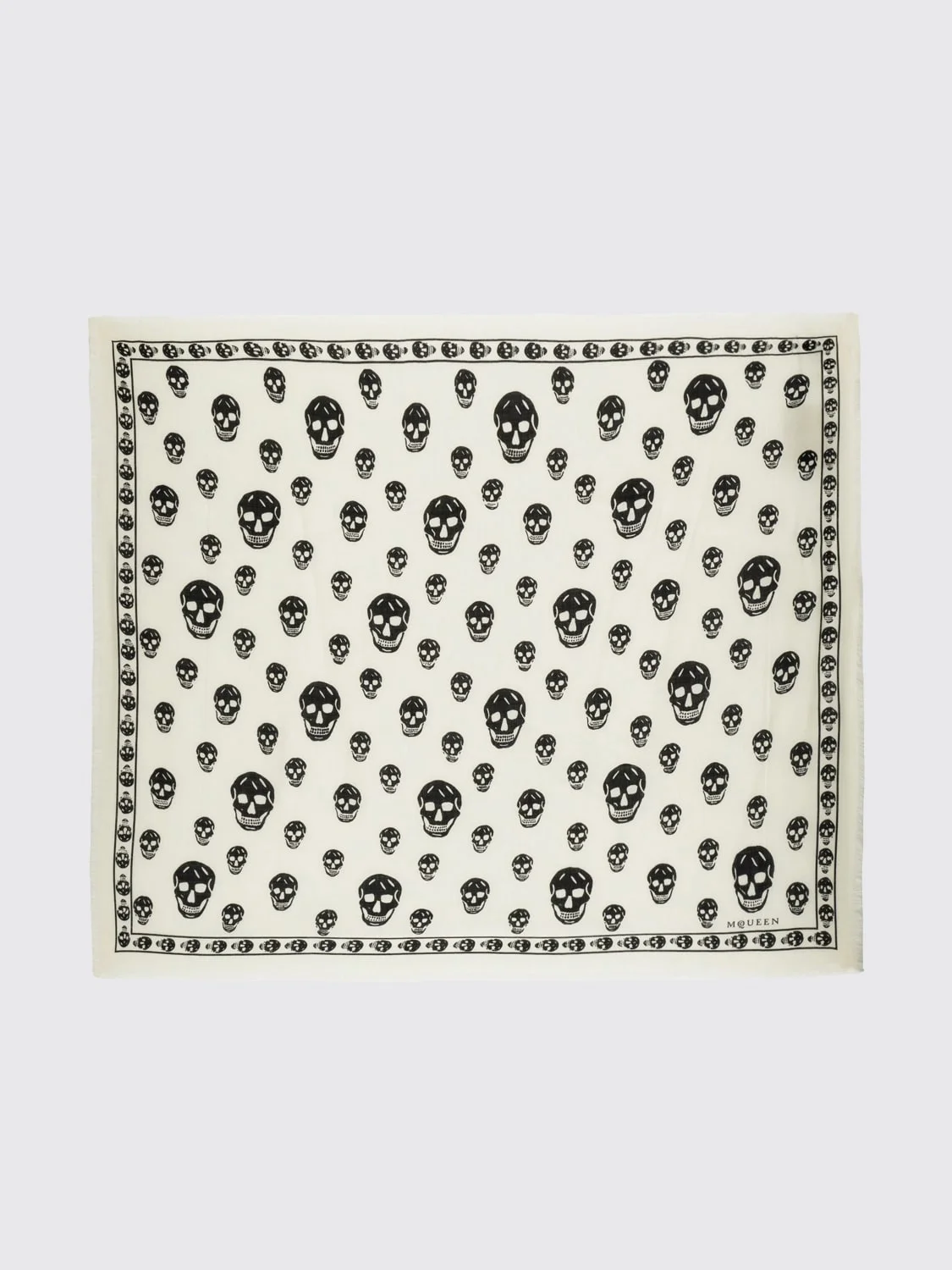 DESCRIPTION - Logo: Lettering - Bottom: Fringed - Shape: Rectangular - Materials: Silk - Pattern: All-over skulls DETAILS AND CARE Composition Silk SIZE AND FIT Sizes not available Designer code: 8078893222Q 9260 Giglio Code: H16104 Designer: Alexander McQueen Collection: Alexander McQueen Woman Category: Accessories Alexander McQueen