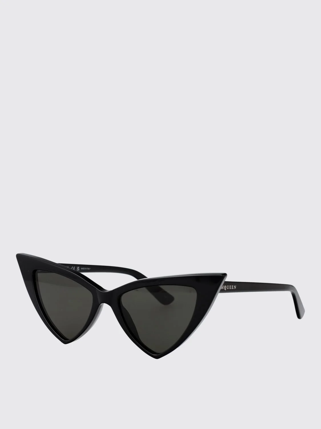 DESCRIPTION - Logo: Lettering - Model: Cat eye - Shape: Triangle - Measurements: Bridge: 17, Lens width: 52 mm, Temples: 150 - Components: Dark lenses, UVA/UVB lenses - Materials: Acetate - Pattern: Plain-colored DETAILS AND CARE Composition | SIZE AND FIT Sizes not available Designer code: AM0518S 002 Giglio Code: H04914 Designer: McQueen Collection: McQueen Woman Category: Accessories McQueen