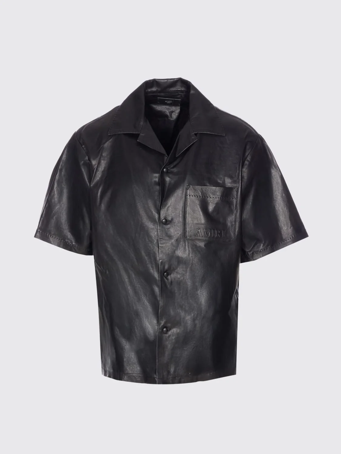 DESCRIPTION - Style: Rock - Logo: Tone-on-tone - Model: Bowling - Neck: Cuban collar - Shoulders: Relaxed - Sleeves: Short - Closure: With buttons - Pockets: Patch pocket - Bottom: With straight hemline - Materials: Leather - Pattern: Plain-colored DETAILS AND CARE Composition _100% LE SIZE AND FIT Sizes not available Size and fit Relaxed fit Designer code: AMLTIR1017 BLACK Giglio Code: H37771 Designer: Amiri Collection: Clothing Amiri Category: Clothing > Shirt