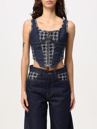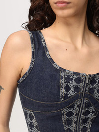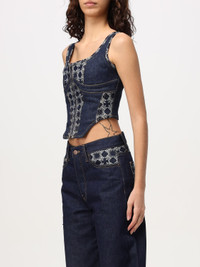 DESCRIPTION - Style: Urban-street - Neckline: Squared - Closure: With zip - Bottom: With straight hemline - Shoulders: With shoulder straps - Model: Bustier - Sleeves: Off-the-shoulder tops - Materials: Denim - Pattern: Geometric DETAILS AND CARE Composition 97% cotton, 3%elastane SIZE AND FIT Sizes not available Size and fit Slim fit Designer code: DNBU1012 INDIGO Giglio Code: G43897 Designer: Amiri Collection: Amiri Woman Category: Clothing Amiri