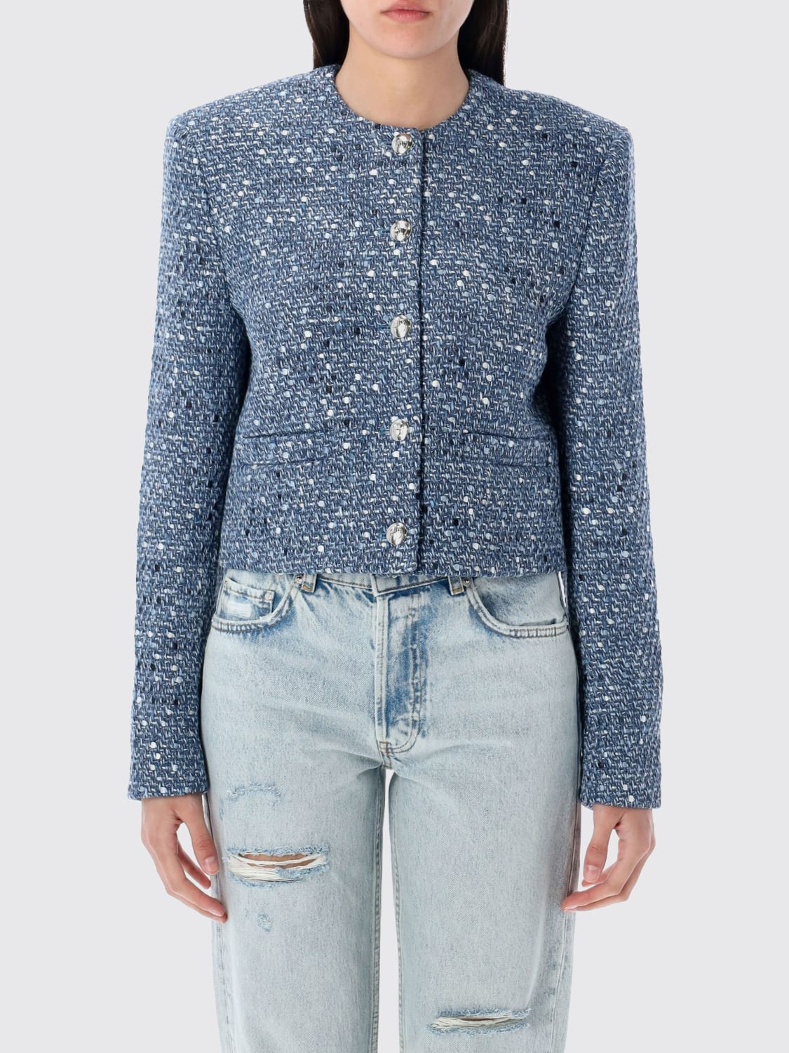 DESCRIPTION - Style: Chic, Classic, Elegant - Details: With jewel buttons - Neckline: Crewneck - Shoulders: Padded, Regular - Sleeves: Long - Closure: With buttons - Pockets: Slit pocket - Bottom: With straight hemline - Length: Short jackets - Materials: Cotton blend, Tweed - Pattern: Plain-colored DETAILS AND CARE Composition 64% cotton 17% polyester 9% viscose 6% other SIZE AND FIT Sizes not available Size and fit Regular fit Designer code: A0110985 BEL1 Giglio Code: H15200 Designer: Anine Bing Collection: Anine Bing Woman Category: Clothing Anine Bing
