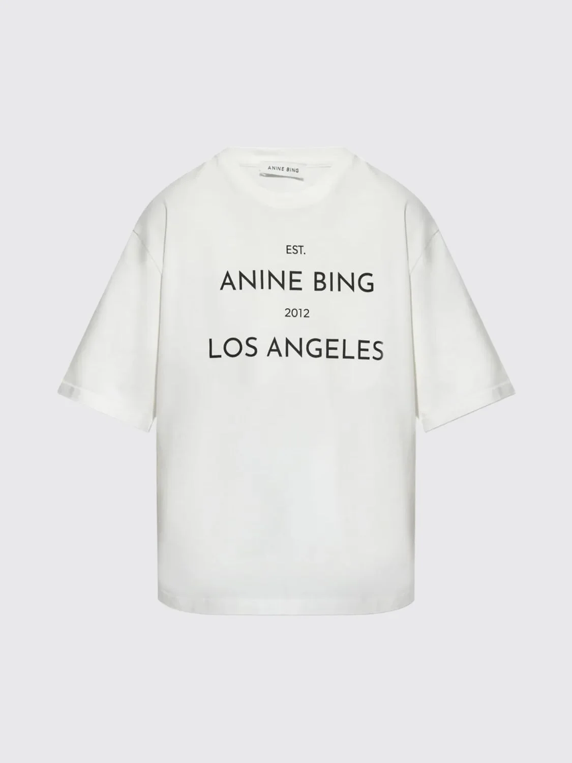 DESCRIPTION - Style: Contemporary - Logo: Contrasting, Print - Model: Crewneck - Neckline: Crewneck - Shoulders: Relaxed - Sleeves: Short - Bottom: With straight hemline - Materials: Cotton - Pattern: Logo DETAILS AND CARE Composition COTONE SIZE AND FIT Sizes not available Size and fit Regular fit Designer code: A0811037 IVY1 Giglio Code: H21965 Designer: Anine Bing Collection: Anine Bing Woman Category: Clothing Anine Bing