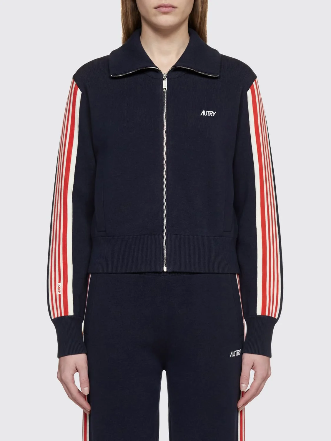DESCRIPTION - Style: Casual, College - Logo: Contrasting, Embroidered - Details: With bands - Shoulders: Regular - Sleeves: Long - Cuffs: Stretch - Closure: With metal zip - Bottom: With ribbed edges, With straight hemline - Neck: Ribbed - Materials: Viscose blend - Pattern: Stripes DETAILS AND CARE Composition 65% Viscosa 35% Poliammide SIZE AND FIT Sizes not available Size and fit Regular fit Designer code: JAPW028B Giglio Code: I04257 Designer: Autry Collection: Clothing Autry Category: Clothing > Sweater