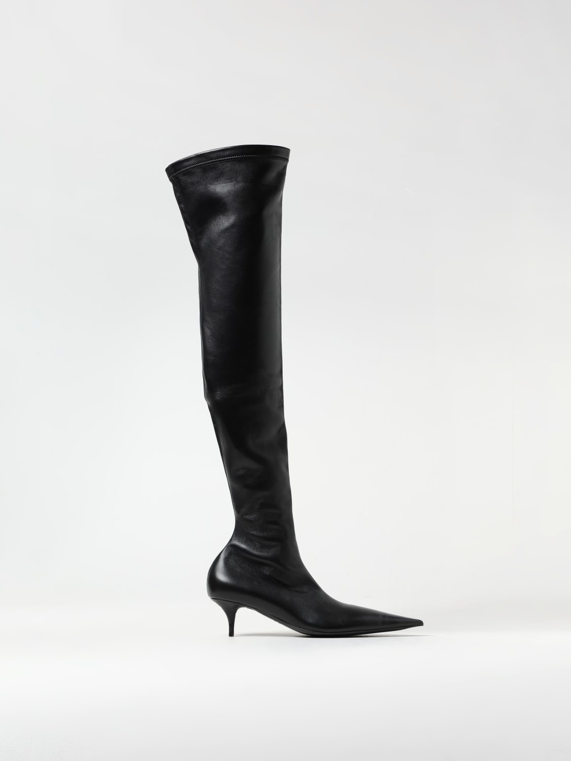 DESCRIPTION - Lining: Leather, With logo - Model: Thigh high boots, Stretch - Closure: Side closure with zip - Toe: Almond - Shaft: Over-the-knee - Sole: Leather - Materials: Nappa leather - Pattern: Plain-colored DETAILS AND CARE Composition 100 AF SIZE AND FIT Sizes Heel: 5,5 cm Designer code: 804475 WB1S1 1080 Giglio Code: 427259 Designer: Balenciaga Collection: Balenciaga Woman Category: Shoes Balenciaga