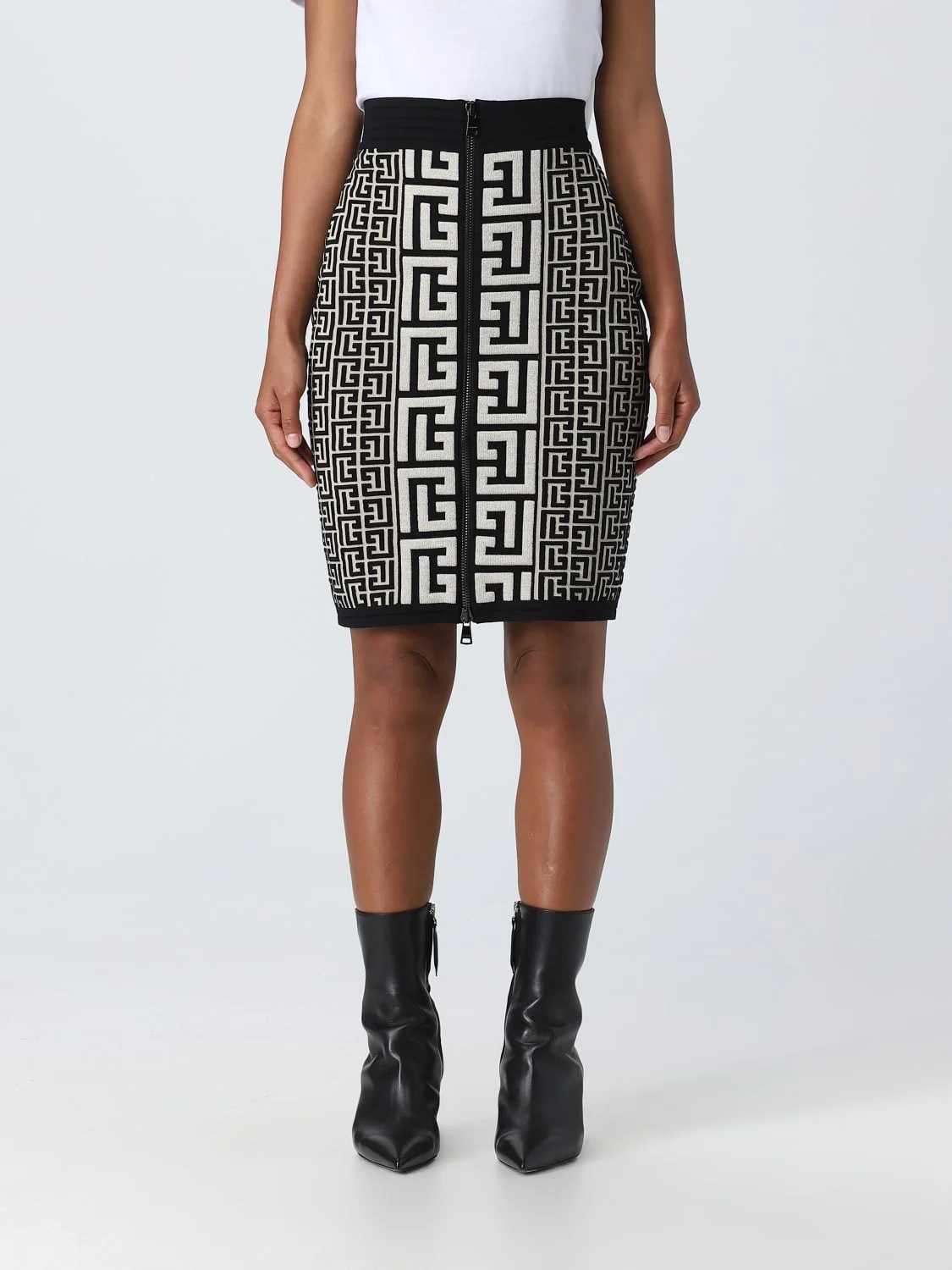 DESCRIPTION - Style: Casual - Model: Knit, Sheath - Closure: With zip and double slider - Waist: High - Bottom: With straight hemline - Length: Midi skirts - Materials: Wool blend - Pattern: Monogram - Logo: Balmain PB Labyrinth monogram DETAILS AND CARE Composition 51%WOOL 28%VISCOSE 19%POLYAMIDE 02%ELAST SIZE AND FIT Sizes not available Size and fit Slim fit Designer code: BF1LC006KE67 GFE Giglio Code: 391134 Designer: Balmain Collection: Balmain Woman Category: Clothing Balmain