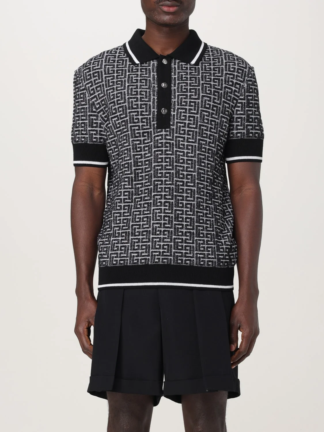 DESCRIPTION - Style: Contemporary - Neck: Classic - Shoulders: Regular - Sleeves: Short - Closure: With 3-button placket - Bottom: With straight hemline - Model: Knit - Materials: Merino wool - Pattern: Monogram - Logo: Balmain PB Labyrinth monogram DETAILS AND CARE Composition 66%MERINOS WOOL 30%LINEN 04%POLYAMIDE SIZE AND FIT Sizes not available Size and fit Regular fit Designer code: EH1GB020KI03 GAB Giglio Code: G57920 Designer: Balmain Collection: Balmain Men Category: Clothing Balmain