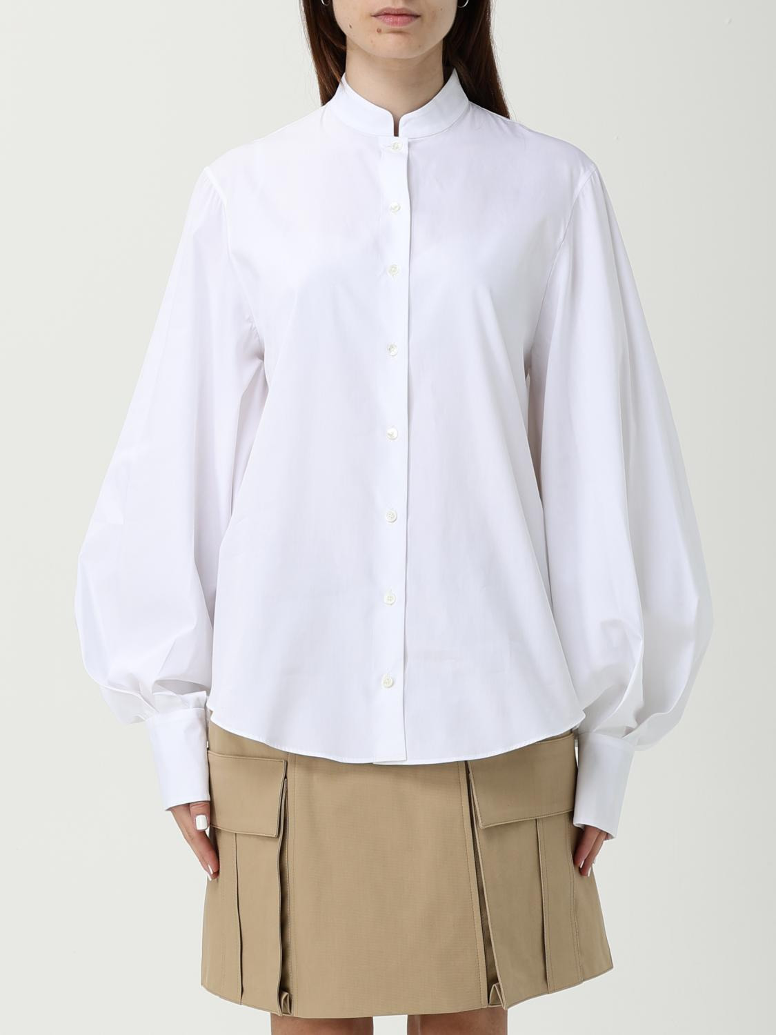 DESCRIPTION - Style: Minimal - Neck: Mandarin collar - Shoulders: Regular - Sleeves: Long sleeve shirts - Closure: With buttons - Bottom: With curved hemline - Materials: Cotton - Pattern: Plain-colored DETAILS AND CARE Composition 100%COTTON SIZE AND FIT Sizes not available Size and fit Regular fit Designer code: FF1HU681CG22 0FA Giglio Code: 431132 Designer: Balmain Collection: Balmain Woman Category: Clothing Balmain