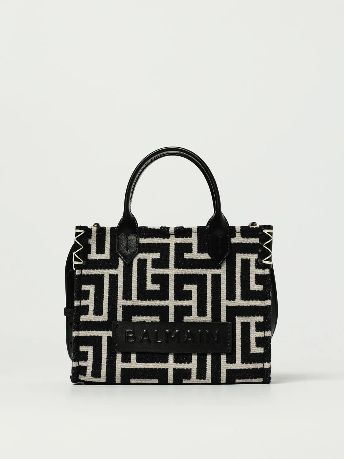 DESCRIPTION - Lining: With patch pockets - Model: Hand - Closure: With snap-hook - Shape: Rectangular - Handle: Double - Shoulder strap: Adjustable - Measurements: Shoulder strap length from shoulder: 59 cm - Materials: Smooth calfskin - Pattern: Logo - Logo: Balmain PB Labyrinth monogram DETAILS AND CARE Composition 88%COTTON 12%POLYESTER SIZE AND FIT Sizes Width : 25 cm Height: 21 cm Depth: 9 cm Handle height: 10,5 cm Designer code: DN1FE818TJDC GFE Giglio Code: 431124 Designer: Balmain Collection: Balmain Woman Category: Bags Balmain