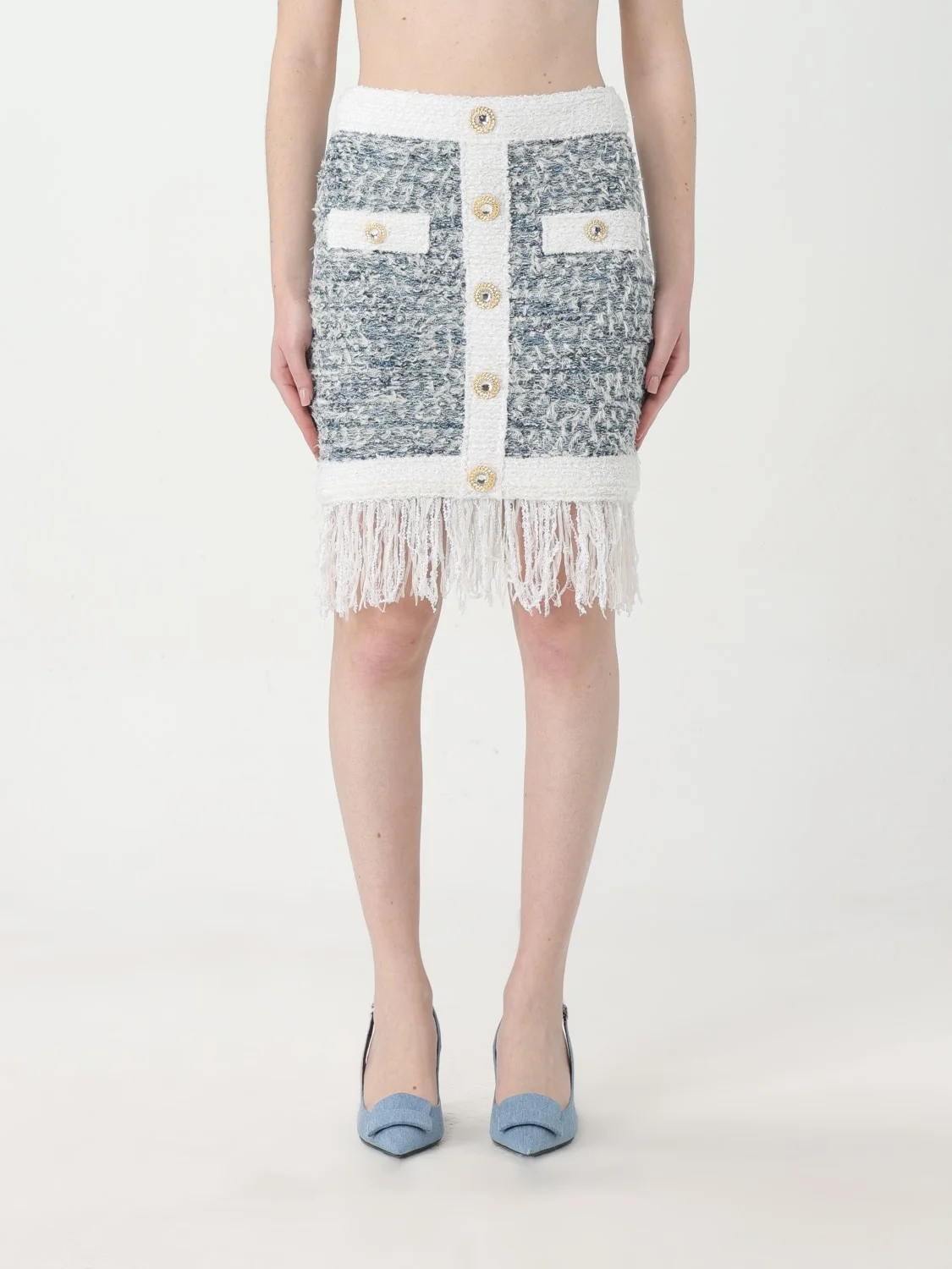 DESCRIPTION - Style: Elegant - Details: With buttons, With fringes - Closure: Back closure with zip - Waist: High - Bottom: Fringed - Length: 미니 스커트 - Materials: Tweed - Pattern: Abstract DETAILS AND CARE Composition Viscose | 53%VISCOSE 17%LINEN 14%COTTON 11%PO SIZE AND FIT Sizes not available Size and fit Slim fit Designer code: CF1LB293KF88 SLJ Giglio Code: F29262 Designer: Balmain Collection: Balmain Woman Category: Clothing Balmain