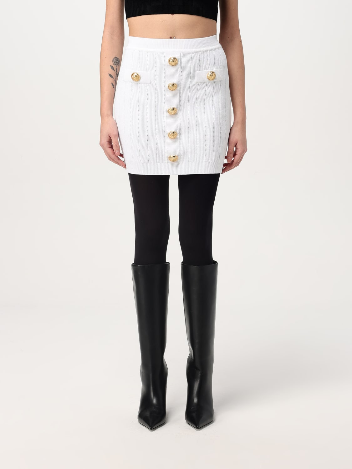 DESCRIPTION - Style: Classic - Details: With buttons - Closure: Back closure with zip - Waist: High - Bottom: With straight hemline - Model: Knit - Length: undefined - Materials: Viscose blend - Pattern: Plain-colored DETAILS AND CARE Composition GENERAL VISCOSE 83 - GENERAL POLYAMIDE 17 - SIZE AND FIT Sizes not available Size and fit Slim fit Designer code: EF1LB290KB07 0FA Giglio Code: G40701 Designer: Balmain Collection: Balmain Woman Category: Clothing Balmain