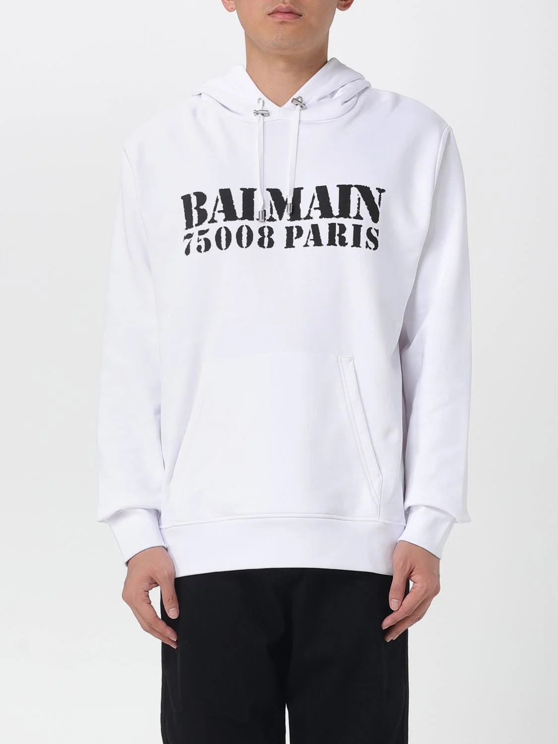 DESCRIPTION - Style: Sporty - Logo: Contrasting - Hood: With drawstrings - Shoulders: Relaxed - Sleeves: Long - Cuffs: Stretch - Pockets: Kangaroo pocket - Bottom: With straight hemline - Model: With hood - Materials: Cotton - Pattern: Logo DETAILS AND CARE Composition Natural (Veg)->Cotton100.0 % SIZE AND FIT Sizes not available Size and fit Regular fit Designer code: FH1JT047BD04 GAB Giglio Code: H20763 Designer: Balmain Collection: Balmain Men Category: Clothing Balmain