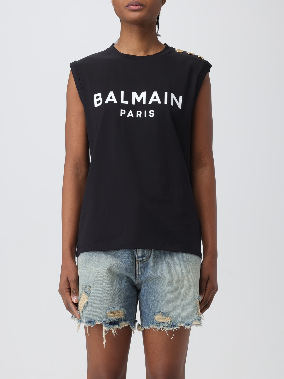DESCRIPTION - Style: Contemporary - Logo: Print - Details: With logo buttons - Model: Crewneck - Neckline: Crewneck - Shoulders: Regular - Sleeves: Sleeveless - Bottom: With straight hemline - Materials: Cotton jersey - Pattern: Logo DETAILS AND CARE Composition _100%CO SIZE AND FIT Sizes not available Size and fit Regular fit Designer code: CF1ED001BB02 EAB Giglio Code: F12741 Designer: Balmain Collection: Balmain Woman Category: Clothing Balmain