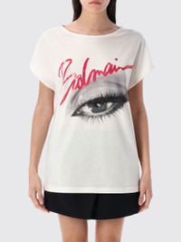 DESCRIPTION - Style: Rock - Logo: Print - Model: Crewneck - Neckline: Crewneck - Shoulders: Regular - Sleeves: Short - Bottom: With straight hemline - Materials: Cotton - Pattern: Graphic DETAILS AND CARE Composition 67% lyocell 33% cotton SIZE AND FIT Sizes not available Size and fit Regular fit Designer code: EF0EG012GE84 GTR Giglio Code: G87605 Designer: Balmain Collection: Balmain Woman Category: Clothing Balmain