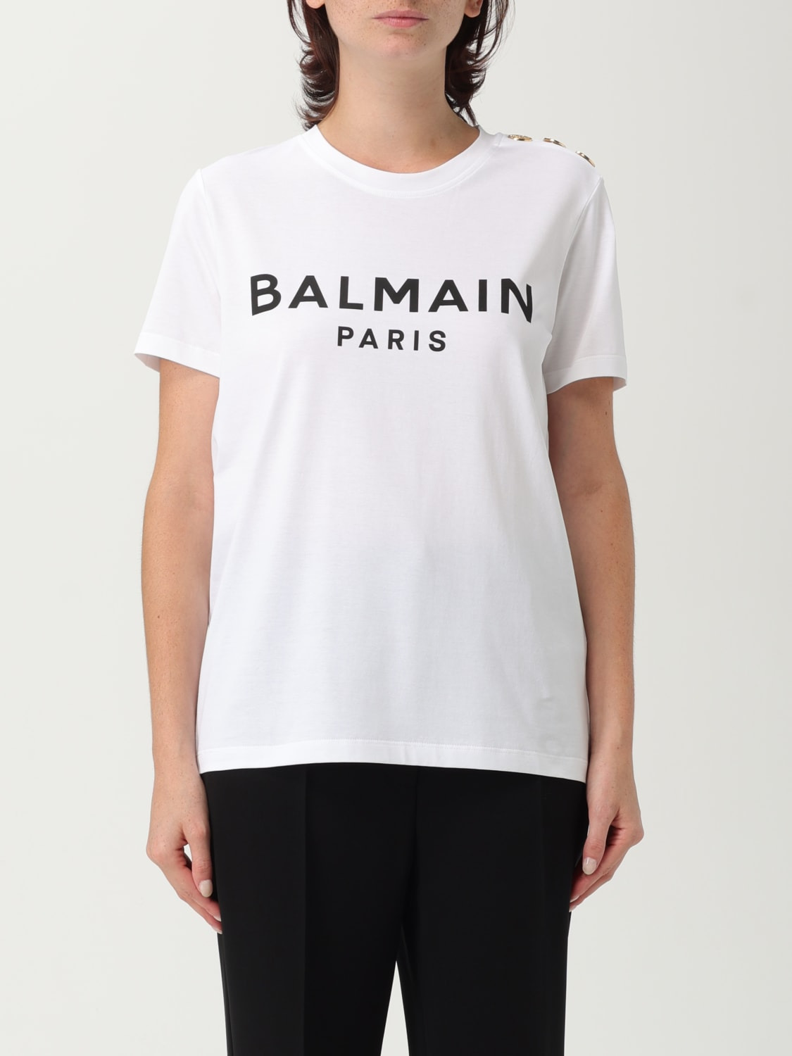 DESCRIPTION - Style: Contemporary - Logo: Contrasting, Print - Details: With buttons - Model: Crewneck - Neckline: Crewneck - Shoulders: With buttons - Sleeves: Short - Bottom: With straight hemline - Materials: Cotton jersey - Pattern: All-over logo DETAILS AND CARE Composition 100%ORGANIC COTTON SIZE AND FIT Sizes not available Size and fit Slim fit Designer code: BF1EF005BB02 GAB Giglio Code: 406312 Designer: Balmain Collection: Balmain Woman Category: Clothing Balmain