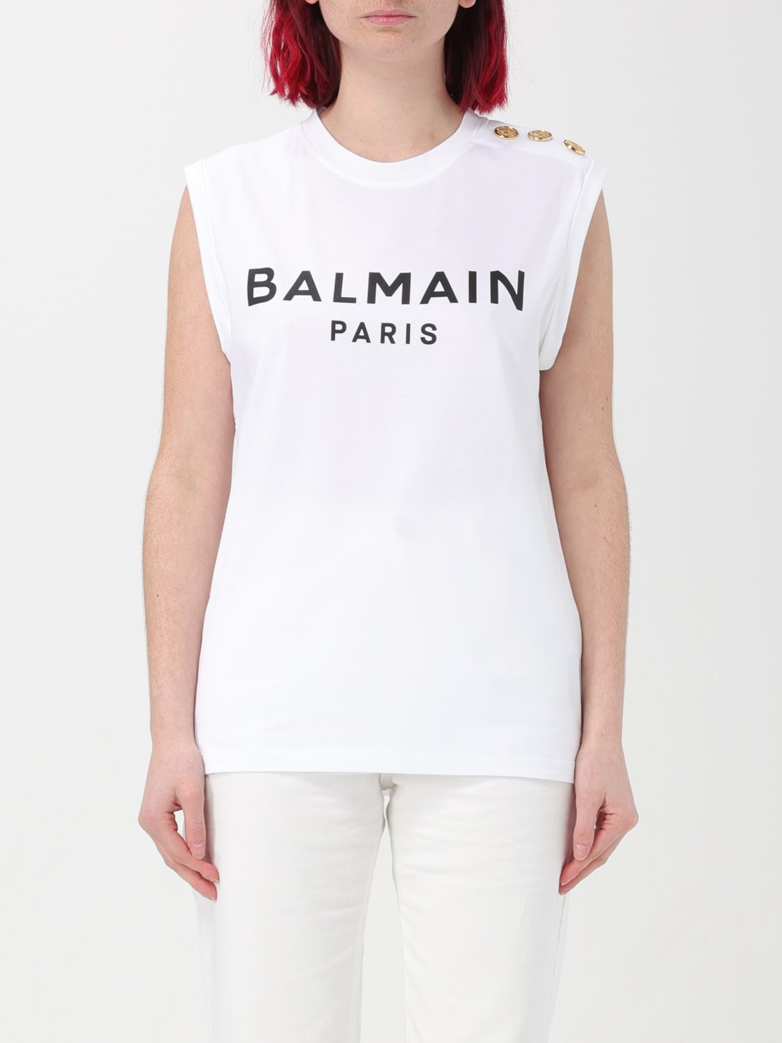 DESCRIPTION - Style: Contemporary - Logo: Print - Details: With logo buttons - Model: Crewneck - Neckline: Crewneck - Shoulders: Regular - Sleeves: Sleeveless - Bottom: With straight hemline - Materials: Cotton jersey - Pattern: Logo DETAILS AND CARE Composition _100%CO SIZE AND FIT Sizes not available Size and fit Regular fit Designer code: CF1ED001BB02 GAB Giglio Code: F12741 Designer: Balmain Collection: Balmain Woman Category: Clothing Balmain