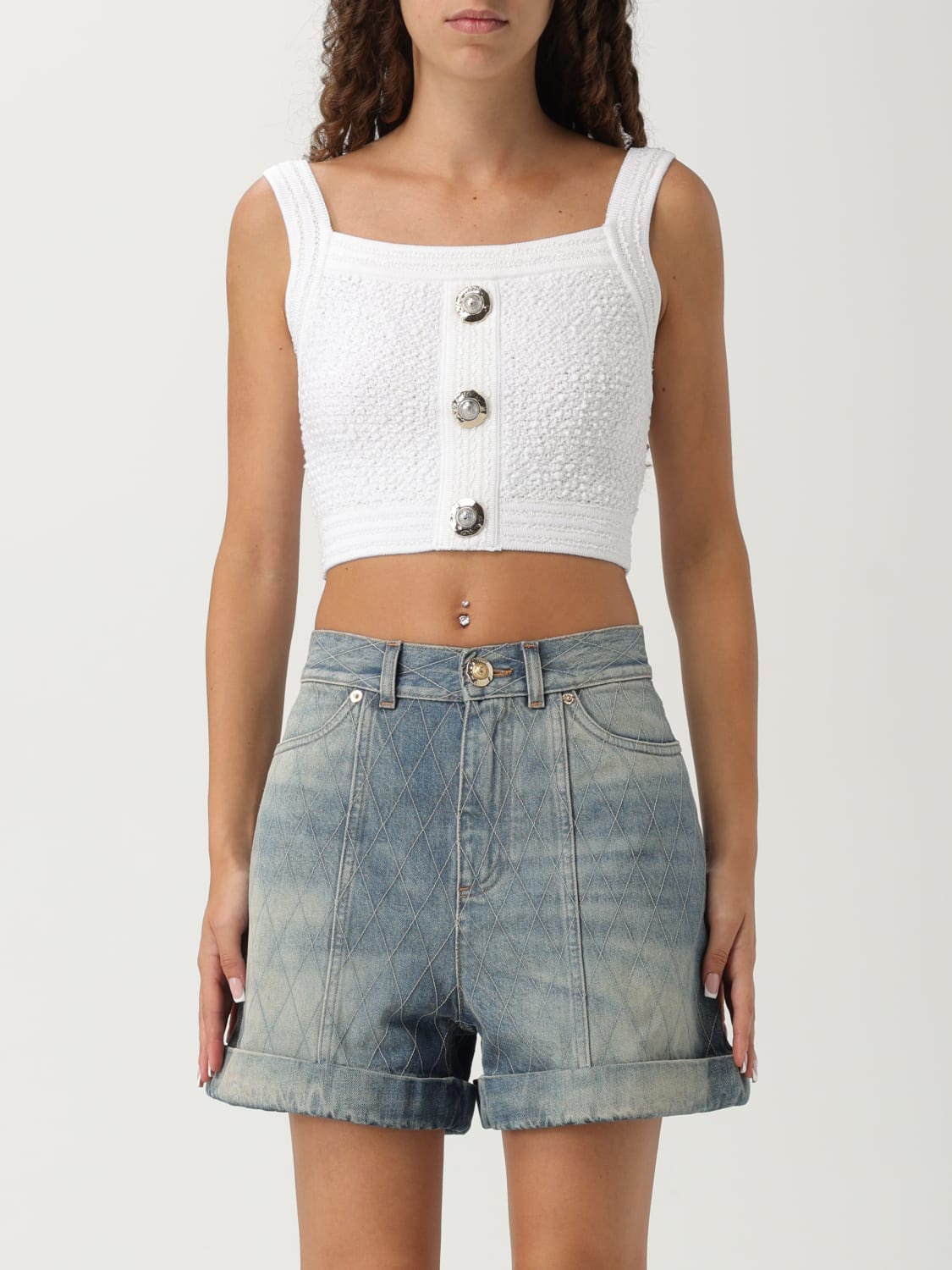 DESCRIPTION - Style: Urban-street - Details: With buttons - Neckline: Squared - Shoulders: Regular - Bottom: With straight hemline - Sleeves: Off-the-shoulder tops - Materials: Tweed - Pattern: Plain-colored DETAILS AND CARE Composition not available SIZE AND FIT Sizes not available Size and fit Slim fit Designer code: FF1AB052KI74 0FA Giglio Code: H14809 Designer: Balmain Collection: Balmain Woman Category: Clothing Balmain