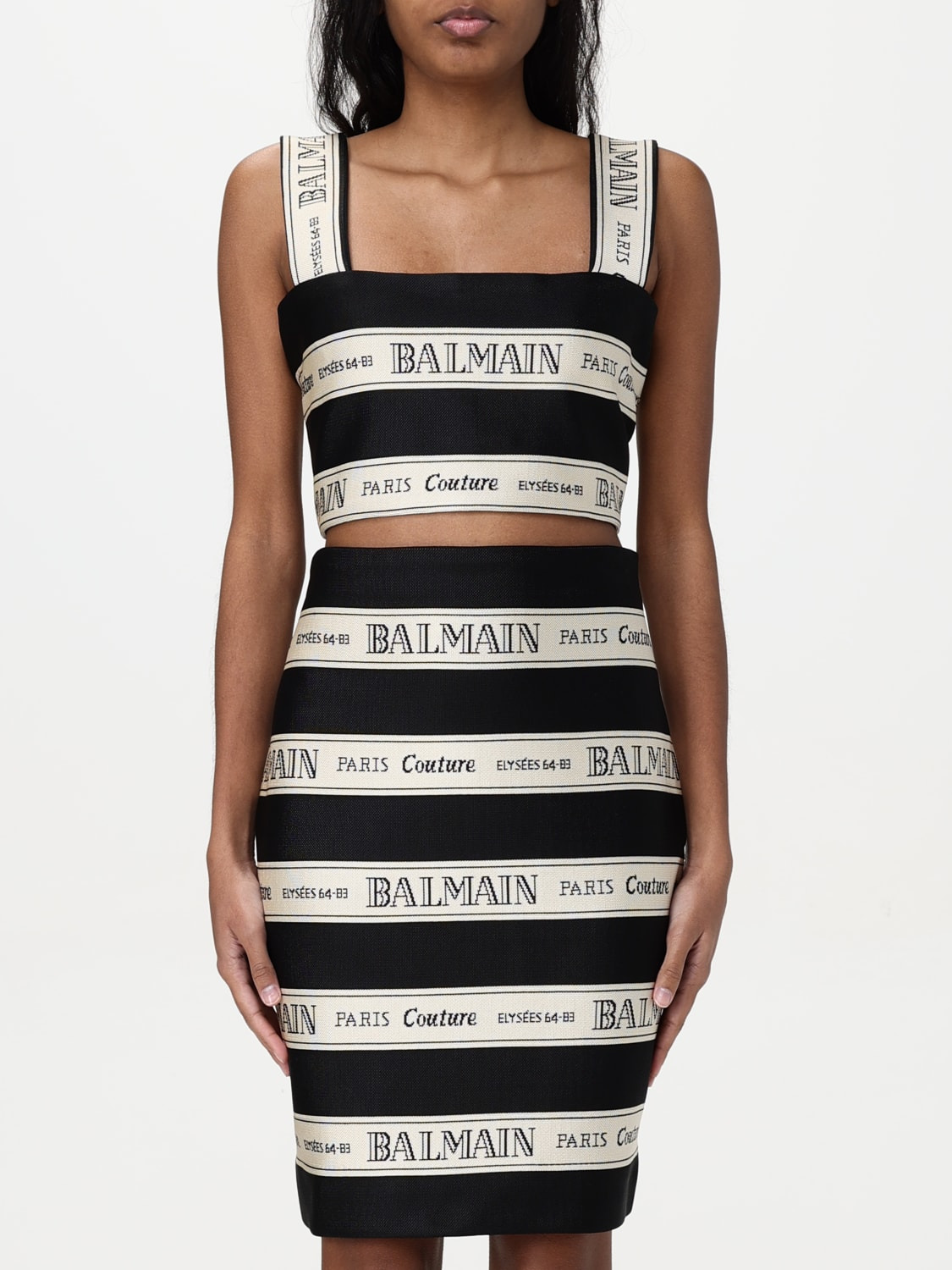 DESCRIPTION - Style: Classic - Neckline: Squared - Shoulders: Regular - Closure: Back closure with zip - Bottom: With straight hemline - Sleeves: Sleeveless tops - Materials: Viscose blend - Pattern: Logo DETAILS AND CARE Composition 97% vi, 2% pa, 1% ea SIZE AND FIT Sizes not available Size and fit Slim fit Designer code: EF1AA370JJ95 EDY Giglio Code: G67168 Designer: Balmain Collection: Balmain Woman Category: Clothing Balmain