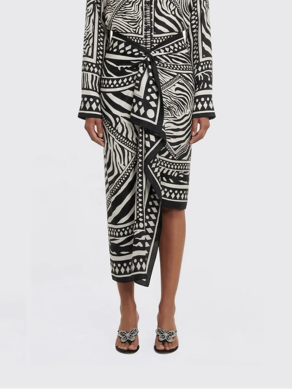 ASYMMETRICAL TWILL SARONG SKIRT WITH FOULARD PRINT
