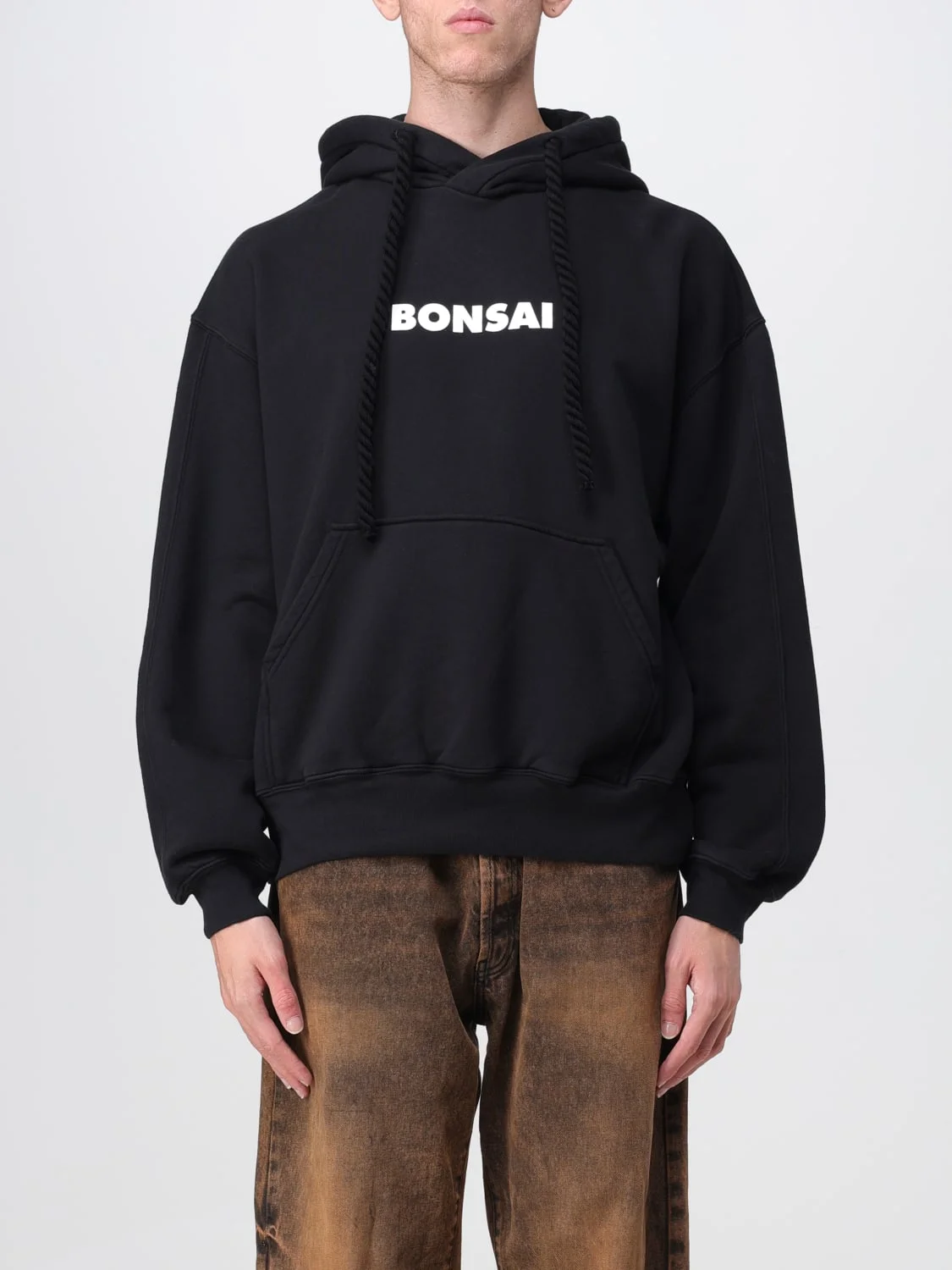 DESCRIPTION - Style: Sporty - Logo: Contrasting, Embroidered - Hood: With drawstrings - Shoulders: Relaxed - Sleeves: Long - Pockets: Kangaroo pocket - Bottom: With straight hemline - Model: With hood - Materials: Cotton - Pattern: Logo, Plain-colored DETAILS AND CARE Composition AF SIZE AND FIT Sizes not available Size and fit Relaxed fit Designer code: SW003001 BLACK Giglio Code: E77989 Designer: Bonsai Collection: Bonsai Men Category: Clothing Bonsai