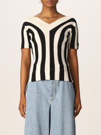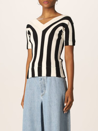 Descrizione - Modern design - Linen - Ribbed finish - Stripes pattern - Bicolor - v-neckline - Short sleeves - Slim fit - Straight hemline DETAILS AND CARE Composition 65% Lino 21% Poliestere 14% Poliammide SIZE AND FIT Sizes not available Designer code: 688928V1N00 1056 Giglio Code: 349980 Designer: Bottega Veneta Collection: Bottega Veneta Woman Category: Clothing Bottega Veneta