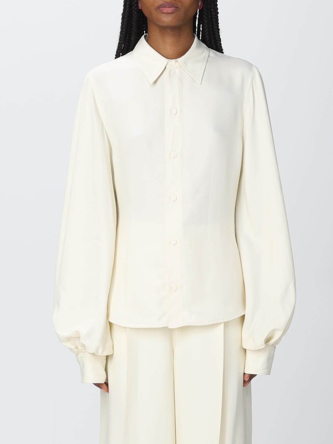 Descrizione - Elegant design - Silk and viscose - Regular fit - Maxi pointy collar - Central closure with buttons - Poet sleeves - Button cuffs - Curved hemline - Made in Italy DETAILS AND CARE Composition 100 AF SIZE AND FIT Sizes not available Designer code: 708324V21J0 9028 Giglio Code: 363357 Designer: Bottega Veneta Collection: Bottega Veneta Woman Category: Clothing Bottega Veneta