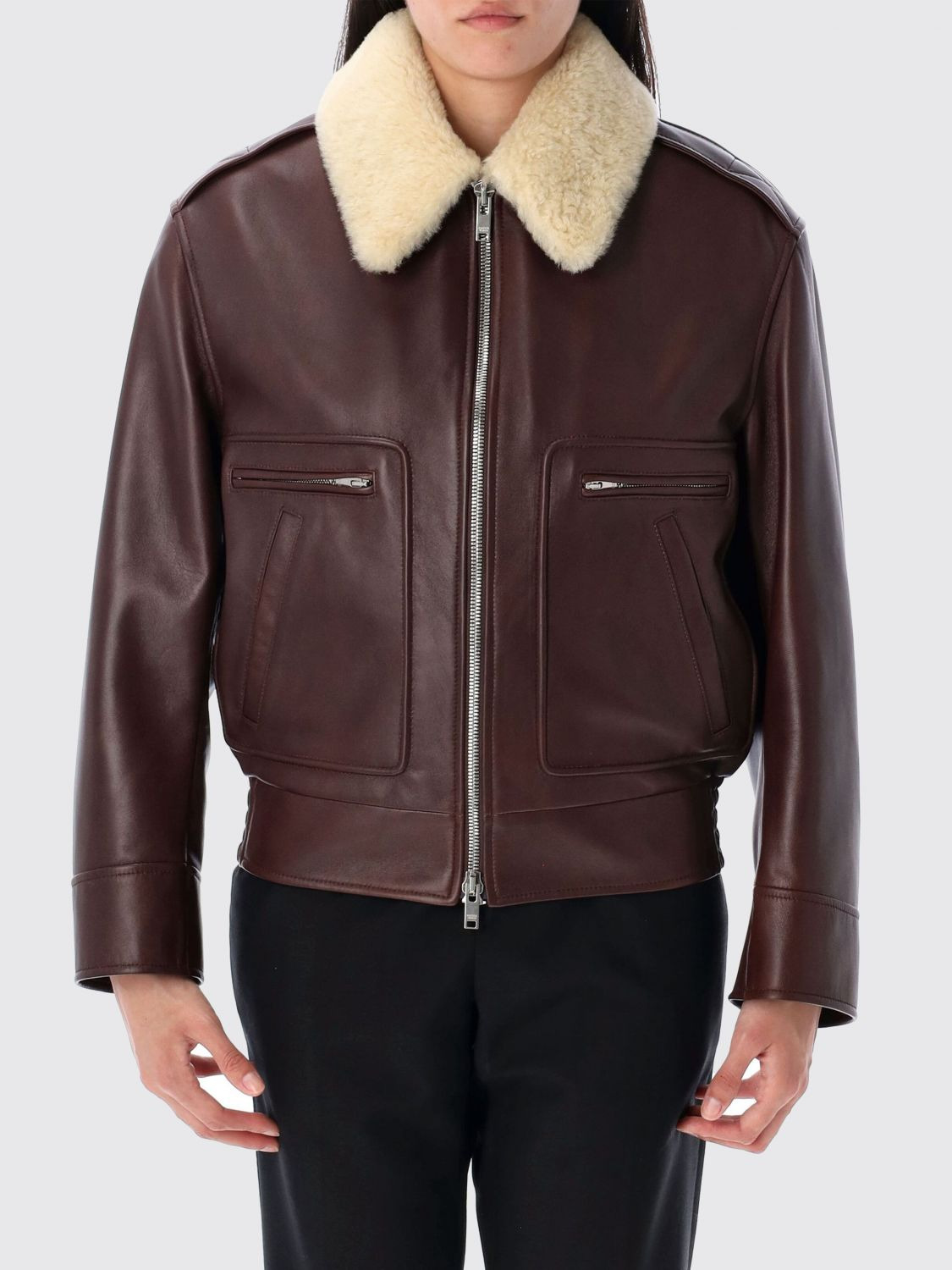 DESCRIPTION - Style: Classic, Vintage - Neck: Fur - Shoulders: Relaxed - Sleeves: Long - Closure: With zip - Pockets: Patch pocket with zip - Bottom: With straight hemline - Length: Short jackets - Materials: Leather - Pattern: Plain-colored DETAILS AND CARE Composition 100% lambskin SIZE AND FIT Sizes not available Size and fit Regular fit Designer code: 832380V5MF0 2107 Giglio Code: H60192 Designer: Bottega Veneta Collection: Bottega Veneta Woman Category: Clothing Bottega Veneta