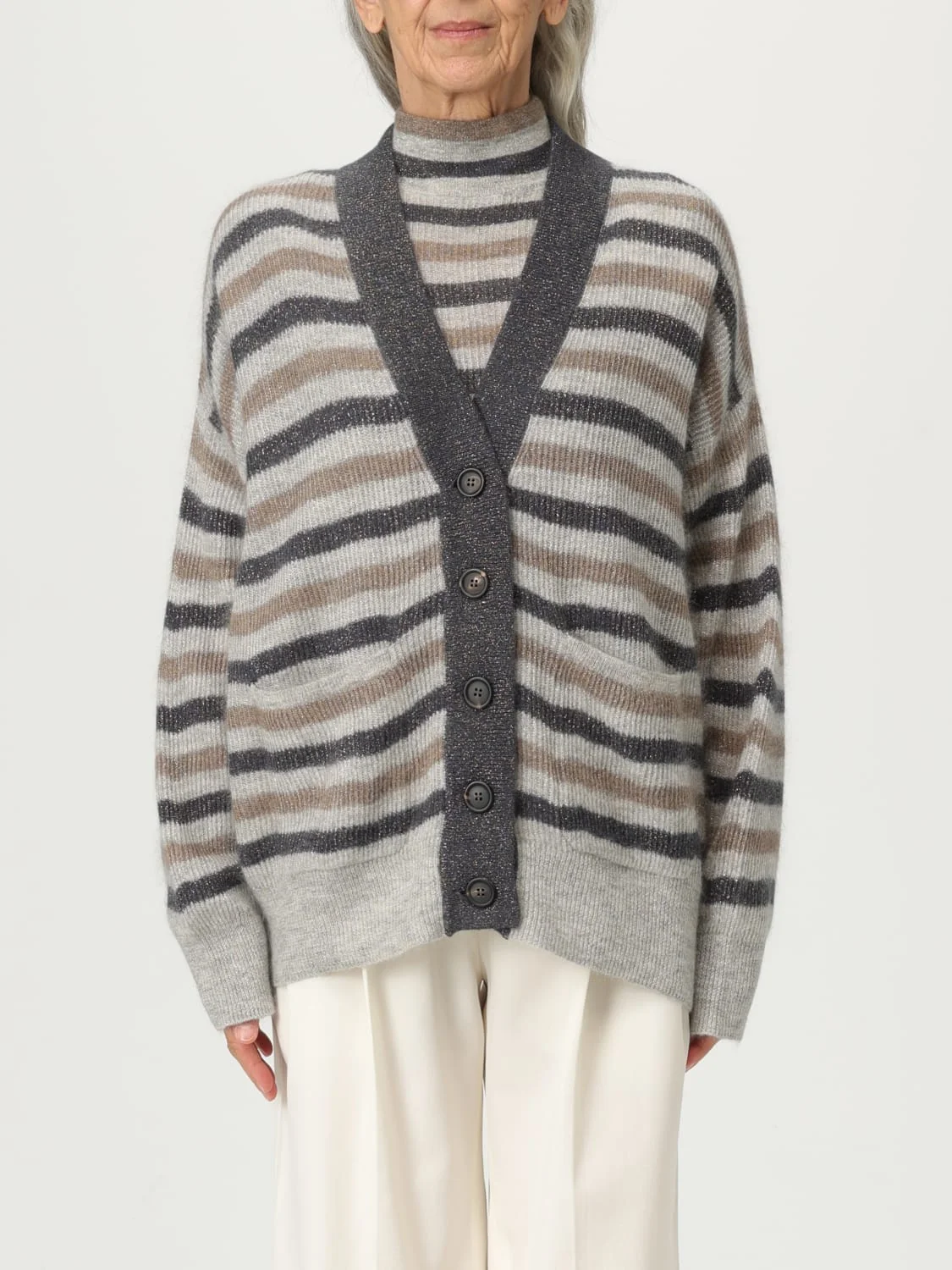 DESCRIPTION - Style: Casual - Neckline: V neckline - Shoulders: Relaxed - Sleeves: Long - Cuffs: Ribbed - Closure: With buttons - Pockets: Patch pocket - Bottom: With ribbed edges, With straight hemline - Materials: Mohair - Pattern: Two-tone stripes DETAILS AND CARE Composition 42% mohair wool 38% polyamide 12% wool 8% met SIZE AND FIT Sizes not available Size and fit Regular fit Designer code: MBG236806P CLM03 Giglio Code: H18666 Designer: Brunello Cucinelli Collection: Brunello Cucinelli Woman Category: Clothing Brunello Cucinelli