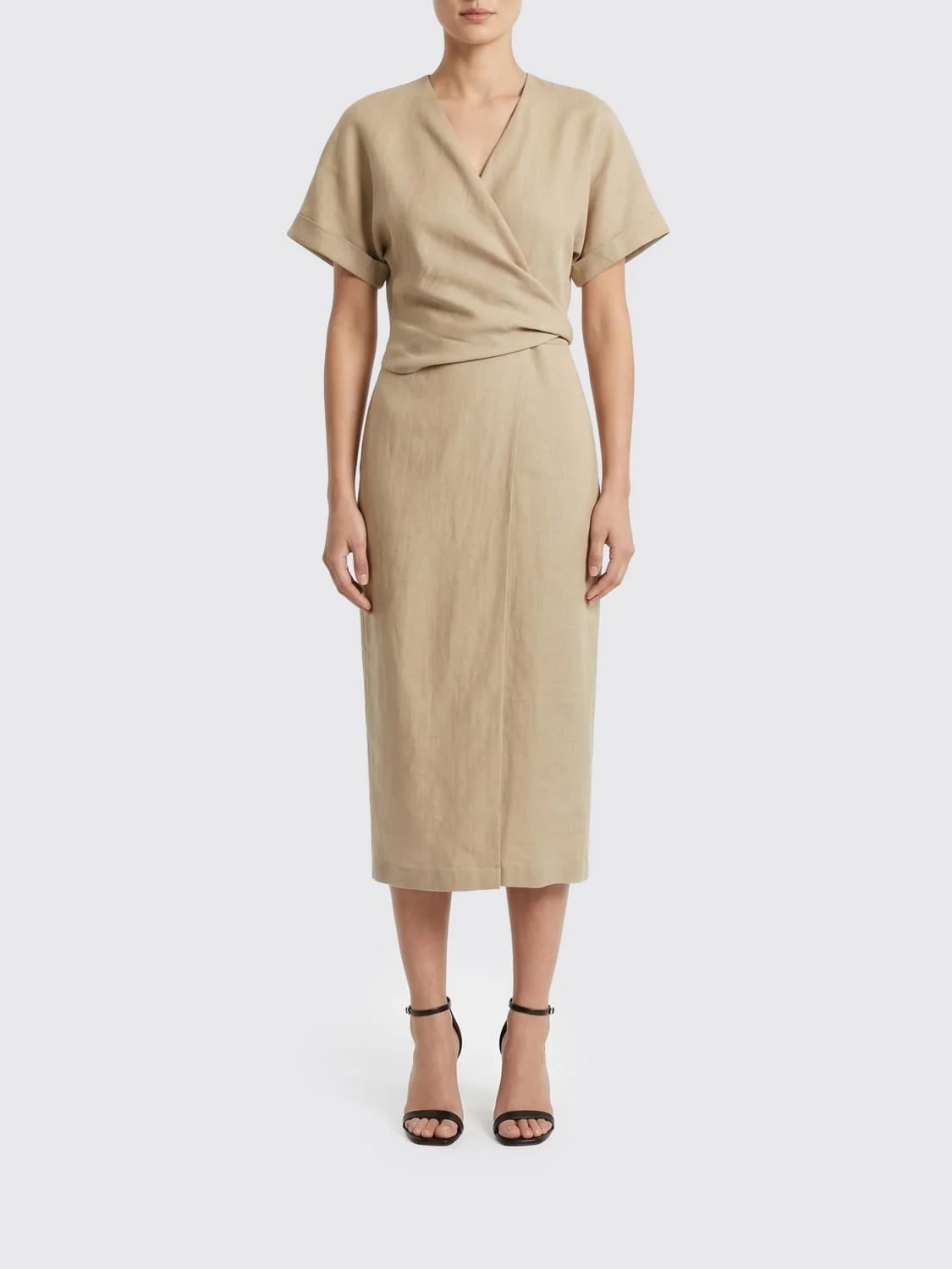 DESCRIPTION - Style: Minimal - Neckline: V neckline - Shoulders: Regular - Closure: With bands to tie - Bottom: With front slit, With straight hemline - Model: Wrap-around - Length: Midi dresses - Occasion: Morning dresses - Sleeves: Short-sleeve dresses - Materials: Linen blend - Pattern: Plain-colored DETAILS AND CARE Composition 72% viscose, 28% linen SIZE AND FIT Sizes not available Size and fit Regular fit Designer code: MH126AHG41 C9195 Giglio Code: H91530 Designer: Brunello Cucinelli Collection: Clothing Brunello Cucinelli Category: Clothing > Dress