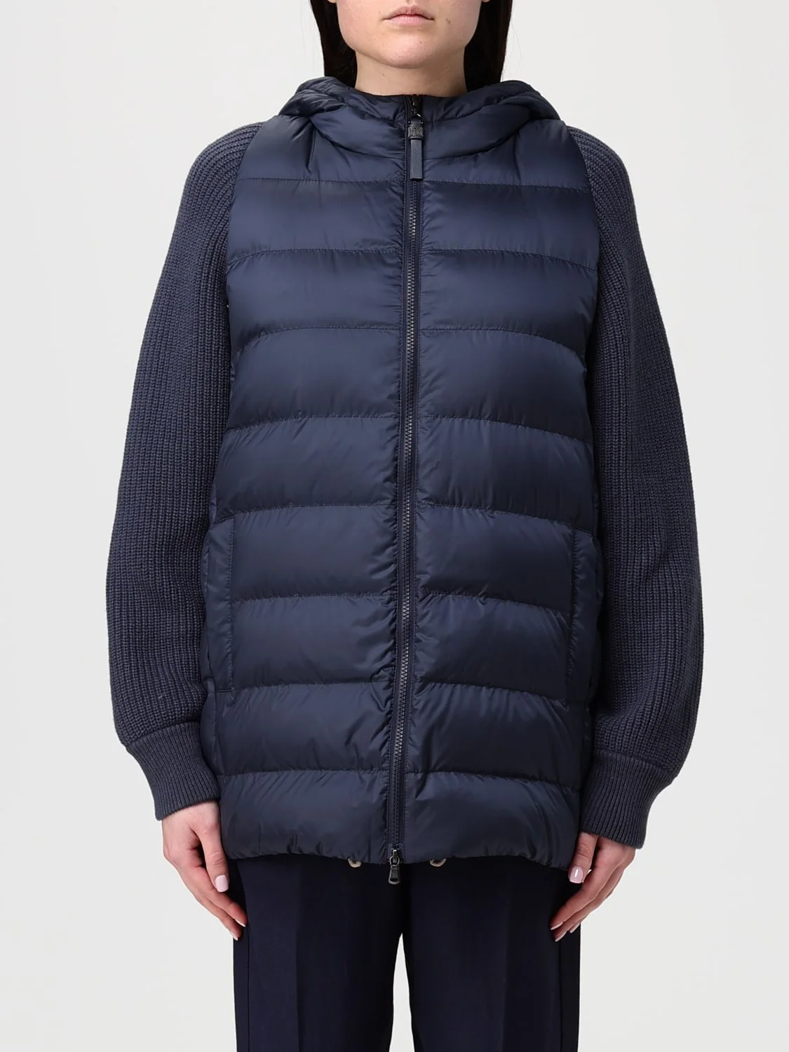 Water-resistant matte nylon hooded down jacket with virgin wool, cashmere and silk knit sleeves and