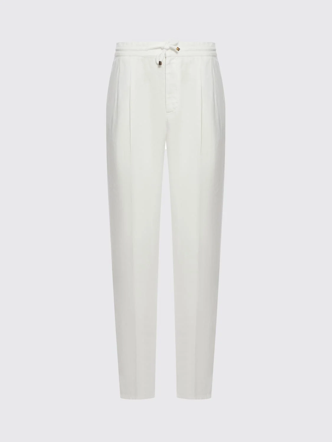 DESCRIPTION - Style: Basic, Minimal - Pockets: America , Back slit pocket - Waist: Medium, Stretch waist with drawstrings - Bottom: With straight hemline - Materials: Linen - Pattern: Plain-colored DETAILS AND CARE Composition 100%LI SIZE AND FIT Sizes not available Size and fit Regular fit Designer code: M243DE1710 C2200 Giglio Code: G49369 Designer: Brunello Cucinelli Collection: Brunello Cucinelli Men Category: Clothing Brunello Cucinelli