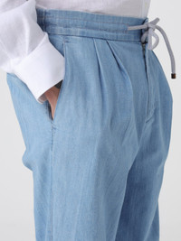 Lightweight denim trousers with drawstring and double pleats