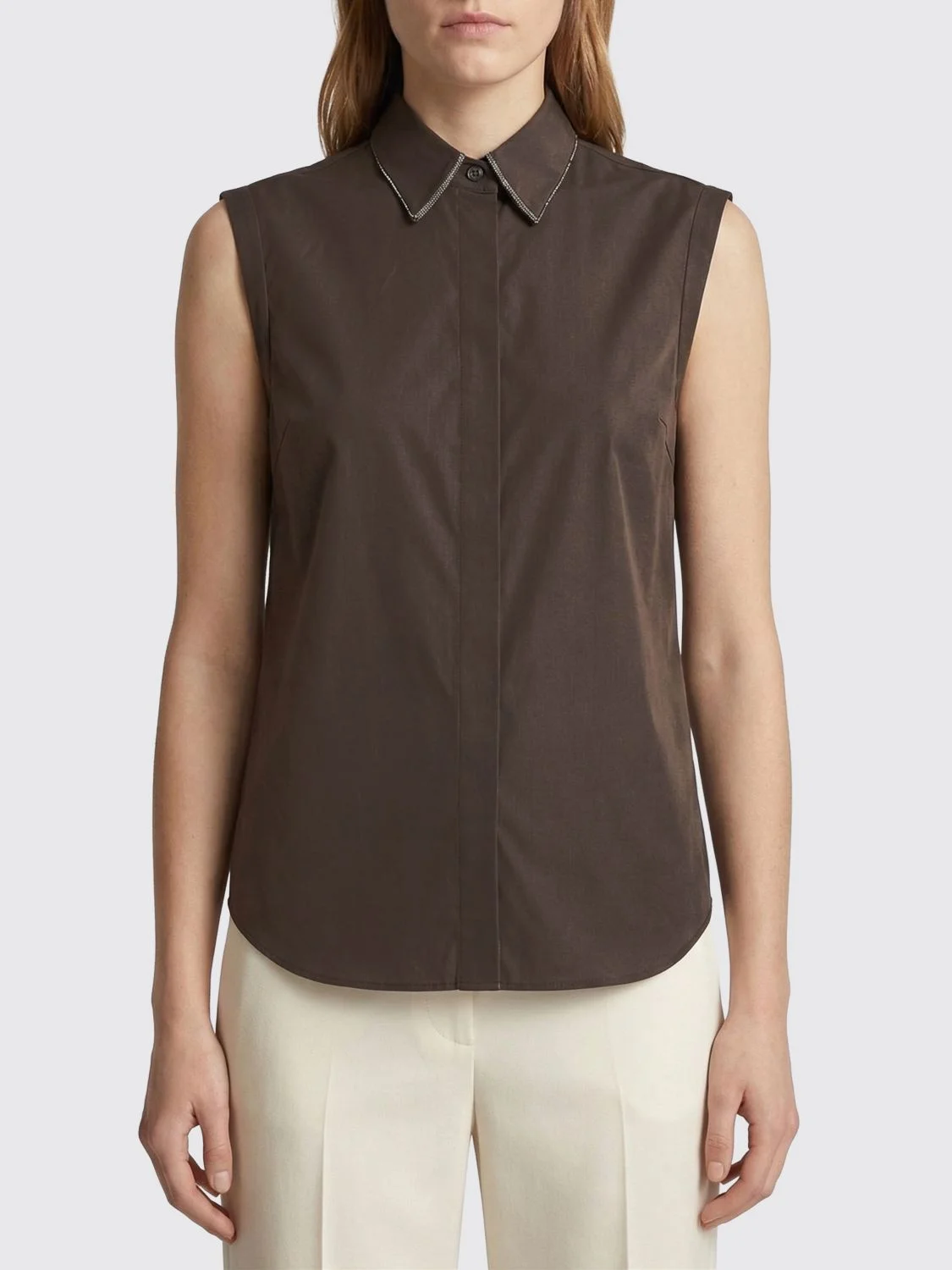 DESCRIPTION - Style: Basic, Casual - Neck: Classic - Shoulders: Regular - Closure: Concealed, With buttons - Bottom: With curved hemline - Details: With nickel-free jewels - Sleeves: Sleeveless shirts - Materials: Stretch cotton - Pattern: Embroidery, Plain-colored DETAILS AND CARE Composition 72%Cotton 23%Polyamide 5%Elastane SIZE AND FIT Sizes not available Size and fit Regular fit Designer code: M0091MA616 C8589 Giglio Code: H81589 Designer: Brunello Cucinelli Collection: Clothing Brunello Cucinelli Category: Clothing > Shirt