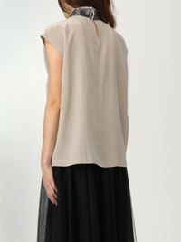 DESCRIPTION - Style: Elegant - Neck: High - Shoulders: Relaxed - Closure: Back - Bottom: With curved hemline - Details: With nickel-free jewels - Sleeves: Short sleeve tops - Materials: Silk - Pattern: undefined DETAILS AND CARE Composition Silk | 100% SE SIZE AND FIT Sizes not available Size and fit Relaxed fit Designer code: MB993EK704 C4274 Giglio Code: H24022 Designer: Brunello Cucinelli Collection: Brunello Cucinelli Woman Category: Clothing Brunello Cucinelli