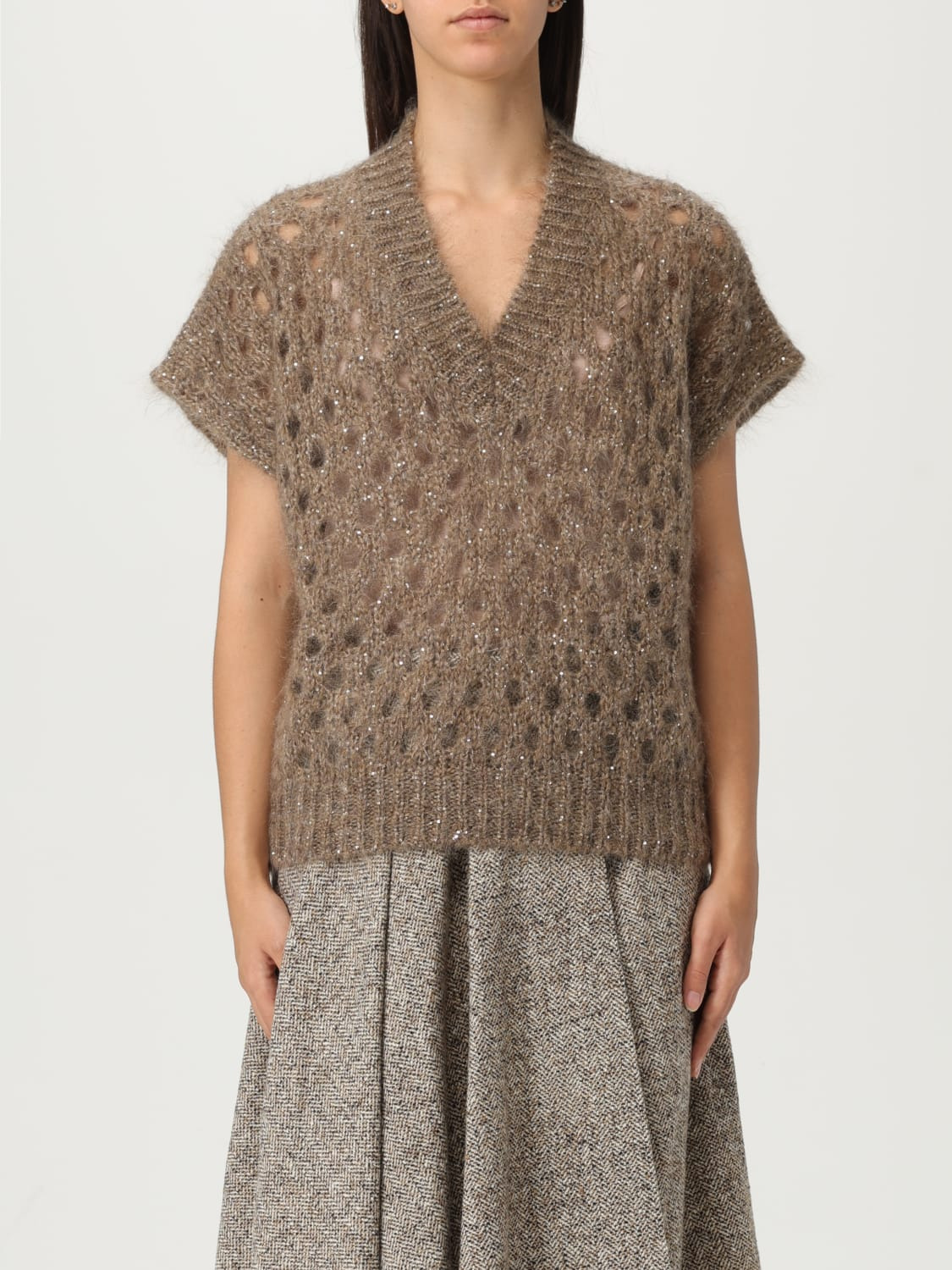 DESCRIPTION - Style: Vintage - Details: With sequins - Neckline: V neckline - Shoulders: Relaxed - Sleeves: Short - Cuffs: Ribbed - Bottom: With straight hemline - Model: Pierced - Materials: Mohair - Pattern: undefined DETAILS AND CARE Composition _54%WM26%PA 15%PL 5%WO SIZE AND FIT Sizes not available Size and fit Regular fit Designer code: MNA326502 COQ76 Giglio Code: H15682 Designer: Brunello Cucinelli Collection: Brunello Cucinelli Woman Category: Clothing Brunello Cucinelli