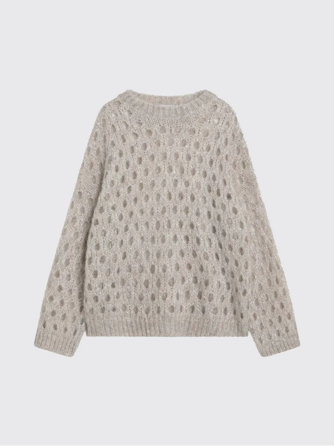 DESCRIPTION - Style: Chic, Vintage - Details: With sequins - Neckline: Crewneck - Shoulders: Relaxed - Sleeves: Long - Cuffs: Ribbed - Bottom: With ribbed edges, With straight hemline - Model: Pierced - Materials: Mohair - Pattern: Embroidery, Plain-colored DETAILS AND CARE Composition _54%WM26%PA 15%PL 5%WO SIZE AND FIT Sizes not available Size and fit Regular fit Designer code: MNA326500 CMG59 Giglio Code: H15684 Designer: Brunello Cucinelli Collection: Brunello Cucinelli Woman Category: Clothing Brunello Cucinelli