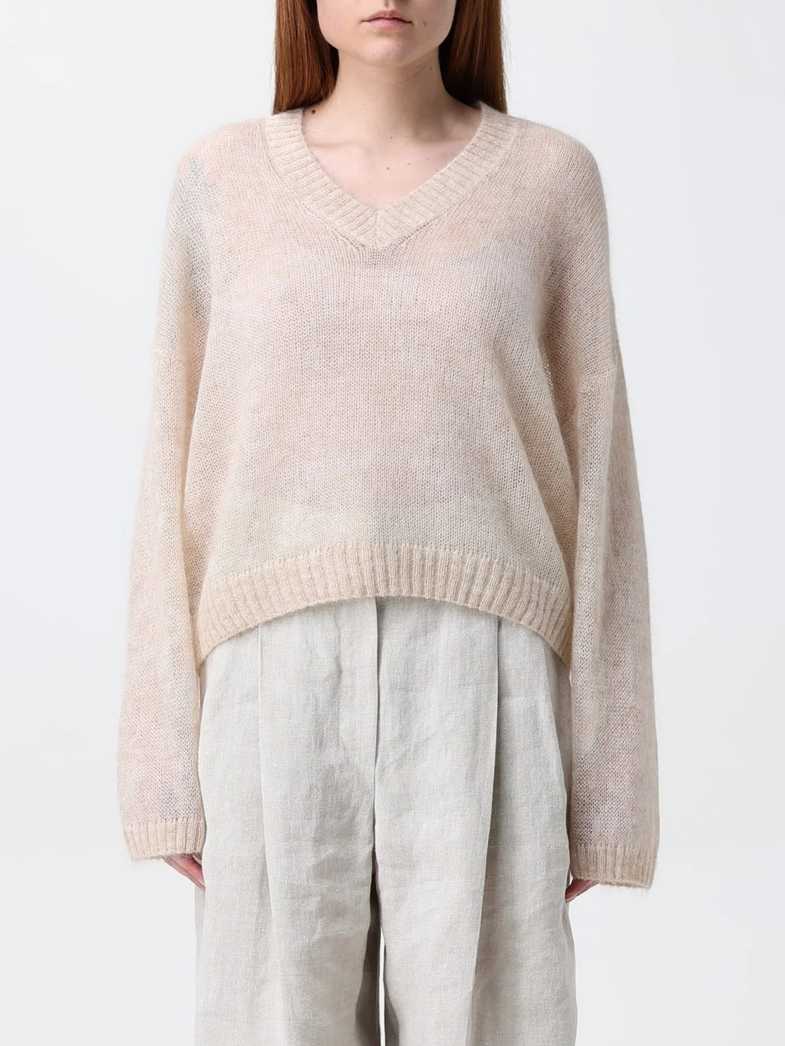 DESCRIPTION - Style: Minimal - Model: Knit - Neckline: V neckline - Shoulders: Relaxed - Sleeves: Long - Bottom: With straight hemline - Materials: Wool, Mohair - Pattern: Plain-colored DETAILS AND CARE Composition GENERAL MOHAIR 50 - GENERAL WOOL 14 - GENERAL SIZE AND FIT Sizes not available Size and fit Relaxed fit Designer code: M2I776822 C3590 Giglio Code: G65711 Designer: Brunello Cucinelli Collection: Brunello Cucinelli Woman Category: Clothing Brunello Cucinelli