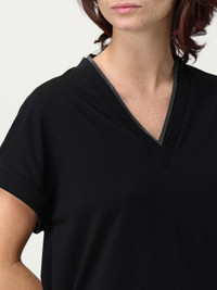 DESCRIPTION - Style: Basic - Neckline: V neckline - Shoulders: Regular - Sleeves: Short - Bottom: With straight hemline - Details: With nickel-free jewels - Materials: Linen - Pattern: Plain-colored DETAILS AND CARE Composition 93%cotton, 7%elastane SIZE AND FIT Sizes not available Size and fit Slim fit Designer code: M0T18BD222 C101 Giglio Code: H20124 Designer: Brunello Cucinelli Collection: Brunello Cucinelli Woman Category: Clothing Brunello Cucinelli