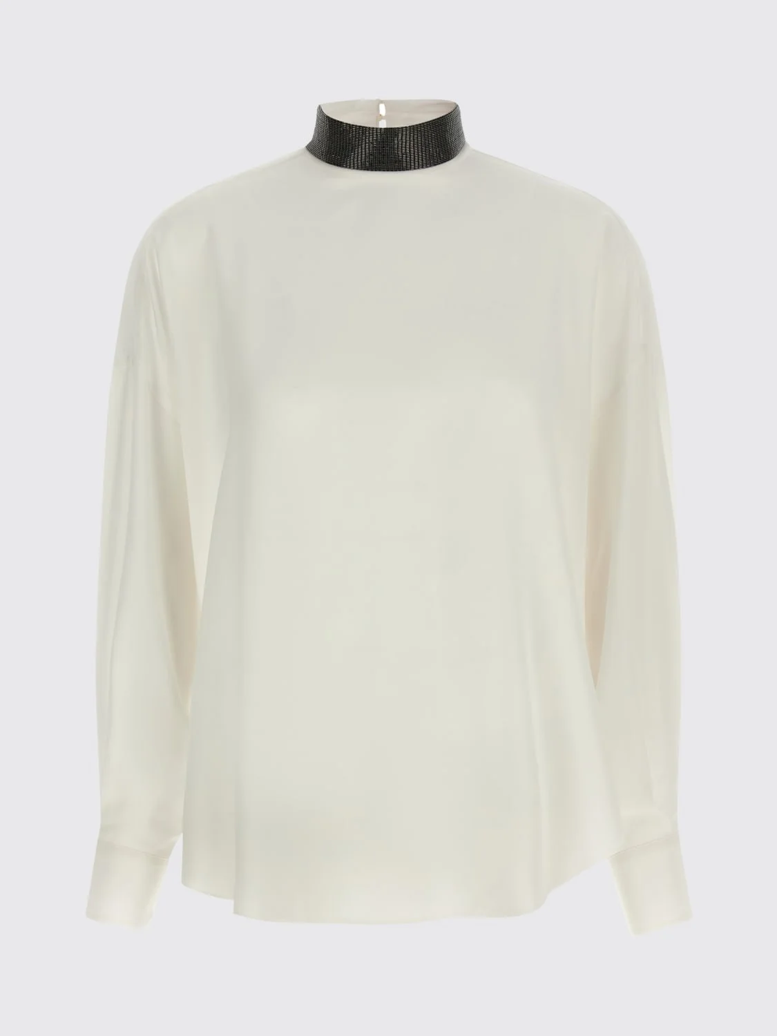 DESCRIPTION - Style: Elegant, Formal - Neck: High - Shoulders: Relaxed - Closure: Back - Bottom: With straight hemline - Details: With nickel-free jewels - Sleeves: Long sleeve tops - Materials: Silk - Pattern: Embroidery, Plain-colored DETAILS AND CARE Composition 100% silk SIZE AND FIT Sizes not available Size and fit Relaxed fit Designer code: MB993EK724 C600 Giglio Code: H30866 Designer: Brunello Cucinelli Collection: Brunello Cucinelli Woman Category: Clothing Brunello Cucinelli