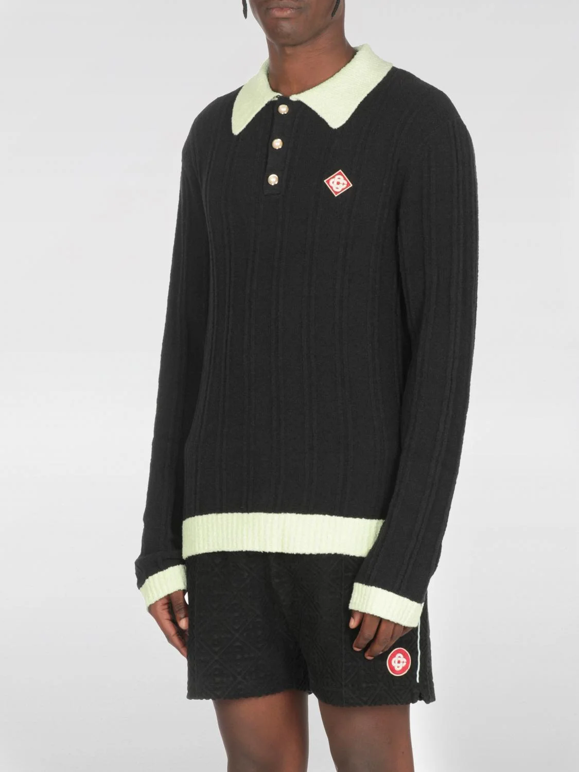 DESCRIPTION - Style: College - Logo: Contrasting - Details: WIth contrasting edges - Neck: Sailor dress - Shoulders: Regular - Sleeves: Long - Cuffs: Ribbed - Closure: With 3-button placket - Bottom: With straight hemline - Model: Knit - Materials: Cotton blend - Pattern: Logo DETAILS AND CARE Composition 72% Cotton 27% Nylon 1% Elastane Details: 95% SIZE AND FIT Sizes not available Size and fit Slim fit Designer code: MPF25KW1000 01 Giglio Code: H33418 Designer: Casablanca Collection: Casablanca Men Category: Clothing Casablanca