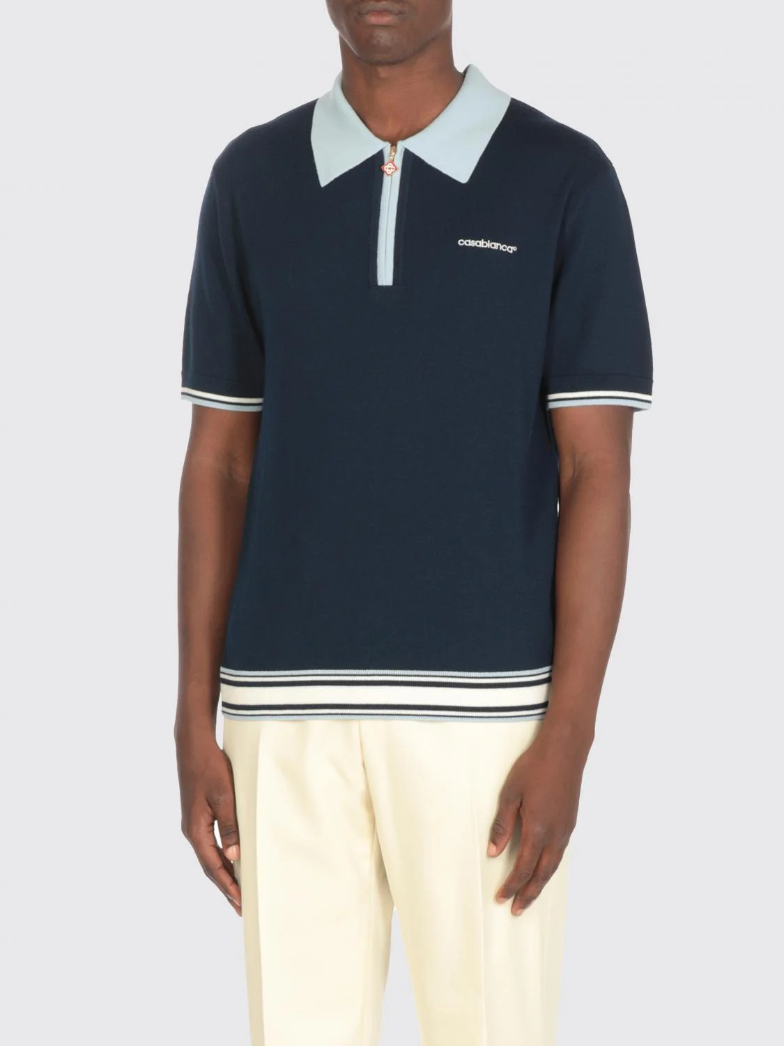 DESCRIPTION - Style: College - Logo: Contrasting - Details: WIth contrasting edges - Neck: Sailor dress - Shoulders: Regular - Sleeves: Short - Cuffs: Ribbed - Closure: With interrupted zip - Bottom: With straight hemline - Model: Knit - Materials: Merino wool - Pattern: Logo DETAILS AND CARE Composition GENERAL MERINO WOOL 100 - SIZE AND FIT Sizes not available Size and fit Slim fit Designer code: MPF25KW1002 01 Giglio Code: H25313 Designer: Casablanca Collection: Casablanca Men Category: Clothing Casablanca