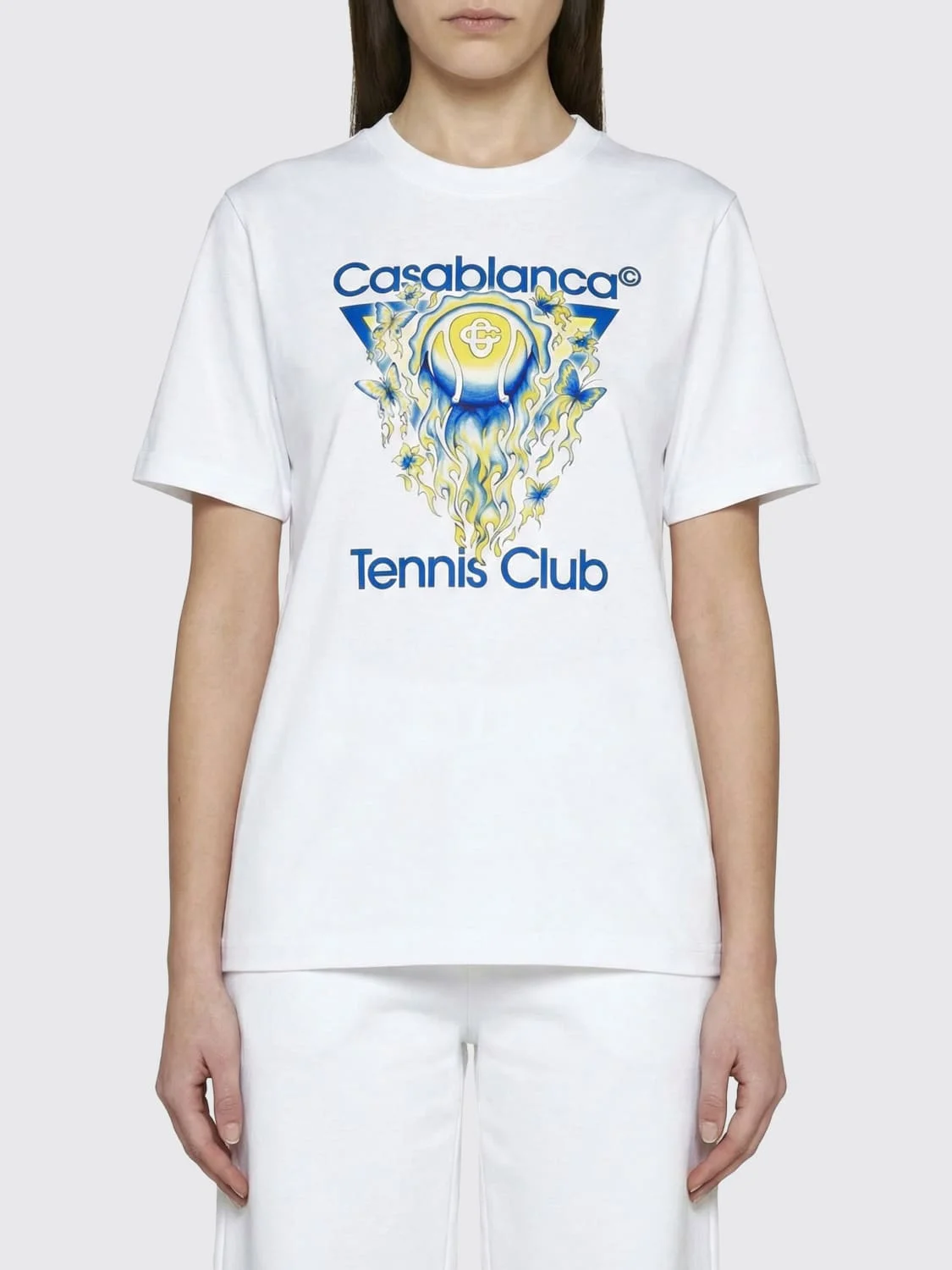 DESCRIPTION - Style: Pop, Sporty - Logo: Print - Model: Crewneck - Neckline: Crewneck - Shoulders: Regular - Sleeves: Short - Bottom: With straight hemline - Materials: Cotton - Pattern: Graphic DETAILS AND CARE Composition Organic Cotton | 100% ORGANIC COTTON SIZE AND FIT Sizes not available Size and fit Slim fit Designer code: WSP26JTS046 02 Giglio Code: H84729 Designer: Casablanca Collection: Casablanca Woman Category: Clothing Casablanca