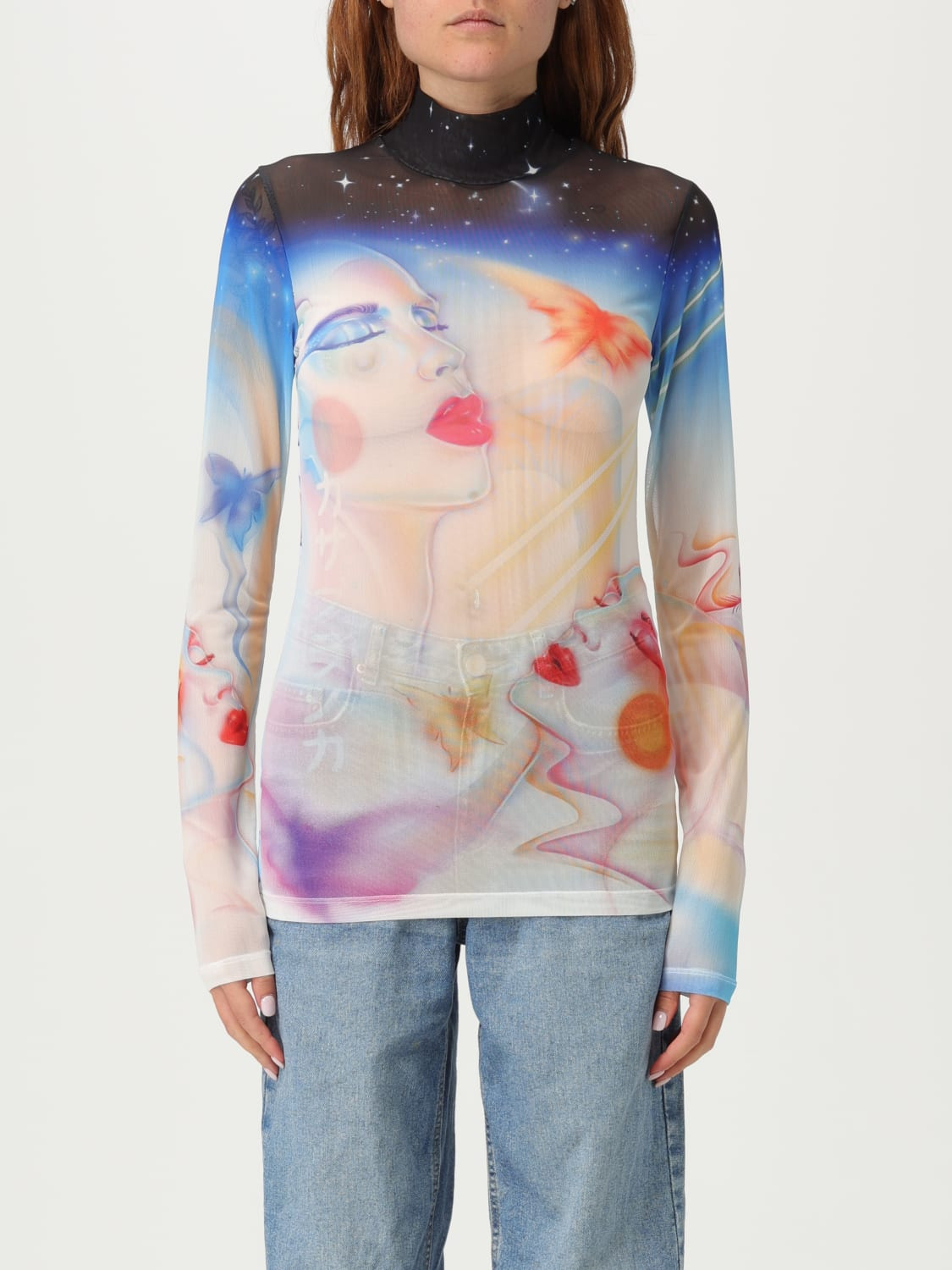 DESCRIPTION - Style: Urban-street - Neck: High - Shoulders: Regular - Bottom: With straight hemline - Sleeves: Long sleeve tops - Materials: Jersey - Pattern: Graphic DETAILS AND CARE Composition _93%pES 7%EA SIZE AND FIT Sizes not available Size and fit Slim fit Designer code: WPF25JTP028 01 Giglio Code: H13180 Designer: Casablanca Collection: Casablanca Woman Category: Clothing Casablanca